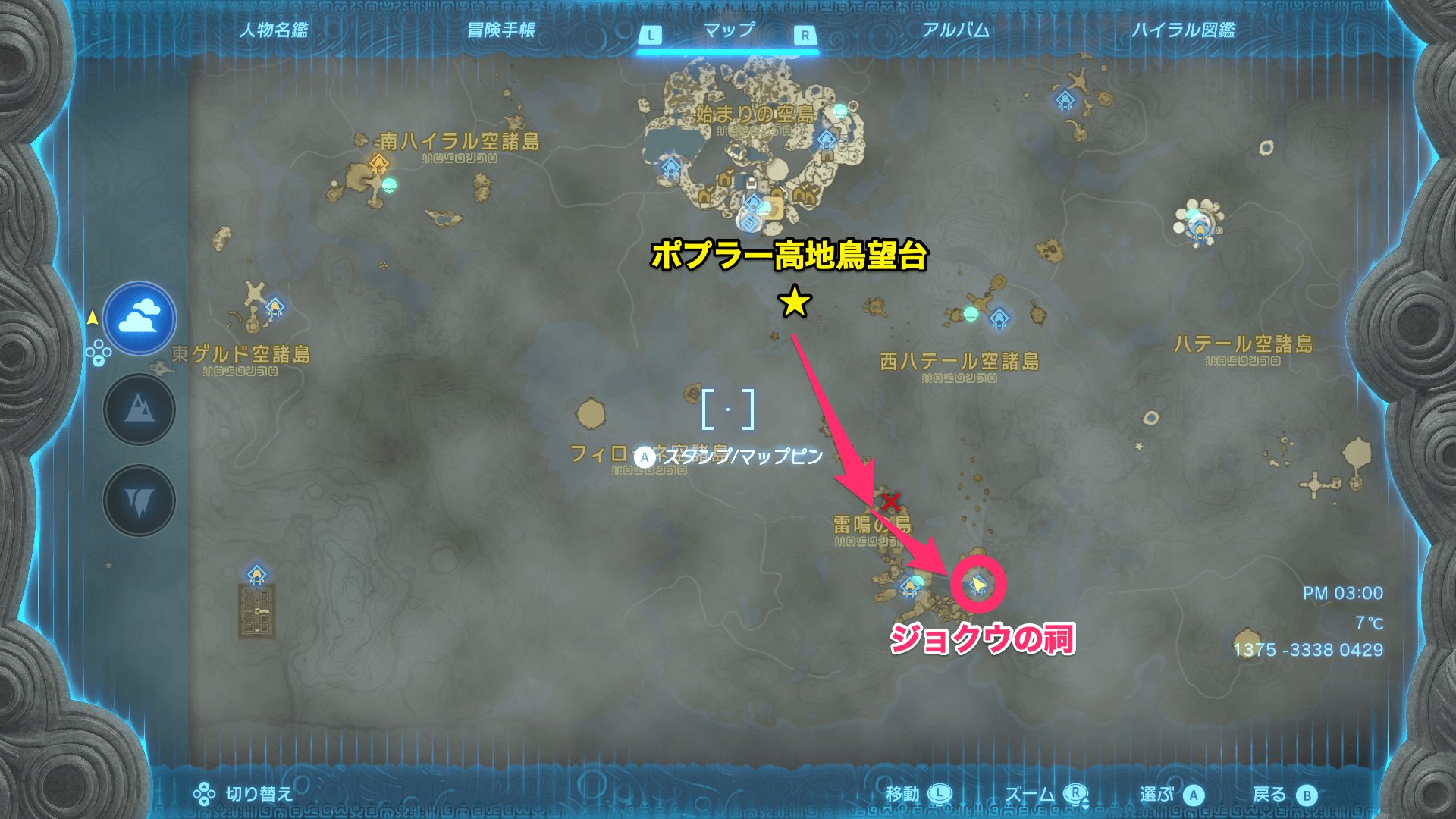 雷鳴の島は、ポプラー高地鳥望台からジャンプして南へ進むと辿り着ける。初期状態のがんばりゲージだと距離が足りないので、がんばりゲージの上限を解放するか、ゲージが回復する料理を用意しておこう。