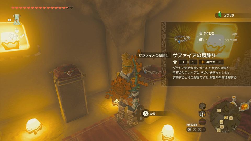 サファイアの頭飾りは、ゲルドの街の宝飾屋で購入できる。購入するには1400ルピーが必要になるため、ルピーを貯めて購入しよう。