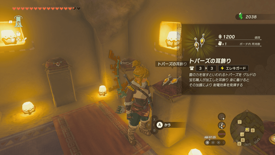 トパーズの頭飾りは、ゲルドの街の宝飾屋で購入できる。購入するには1200ルピーが必要になるため、ルピーを貯めて購入しよう。