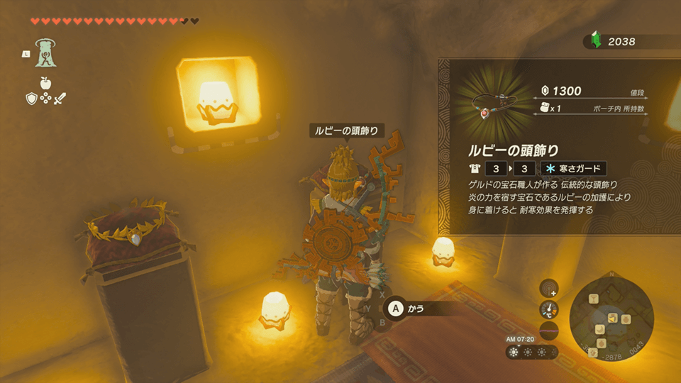 ルビーの頭飾りは、ゲルドの街の宝飾屋で購入できる。購入するには1300ルピーが必要になるため、ルピーを貯めて購入しよう。