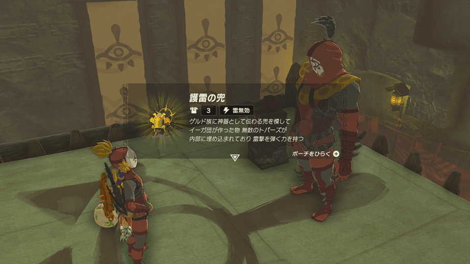 護雷の兜は、イーガ団アジトの鍛錬で9人撃破を達成すると入手できる。ただし、イーガ団アジトに入るにはイーガ団の装備一式を入手して装備する必要がある。 イーガ団装備が揃っていない場合は、先に入手してからイーガ団アジトを訪れよう。