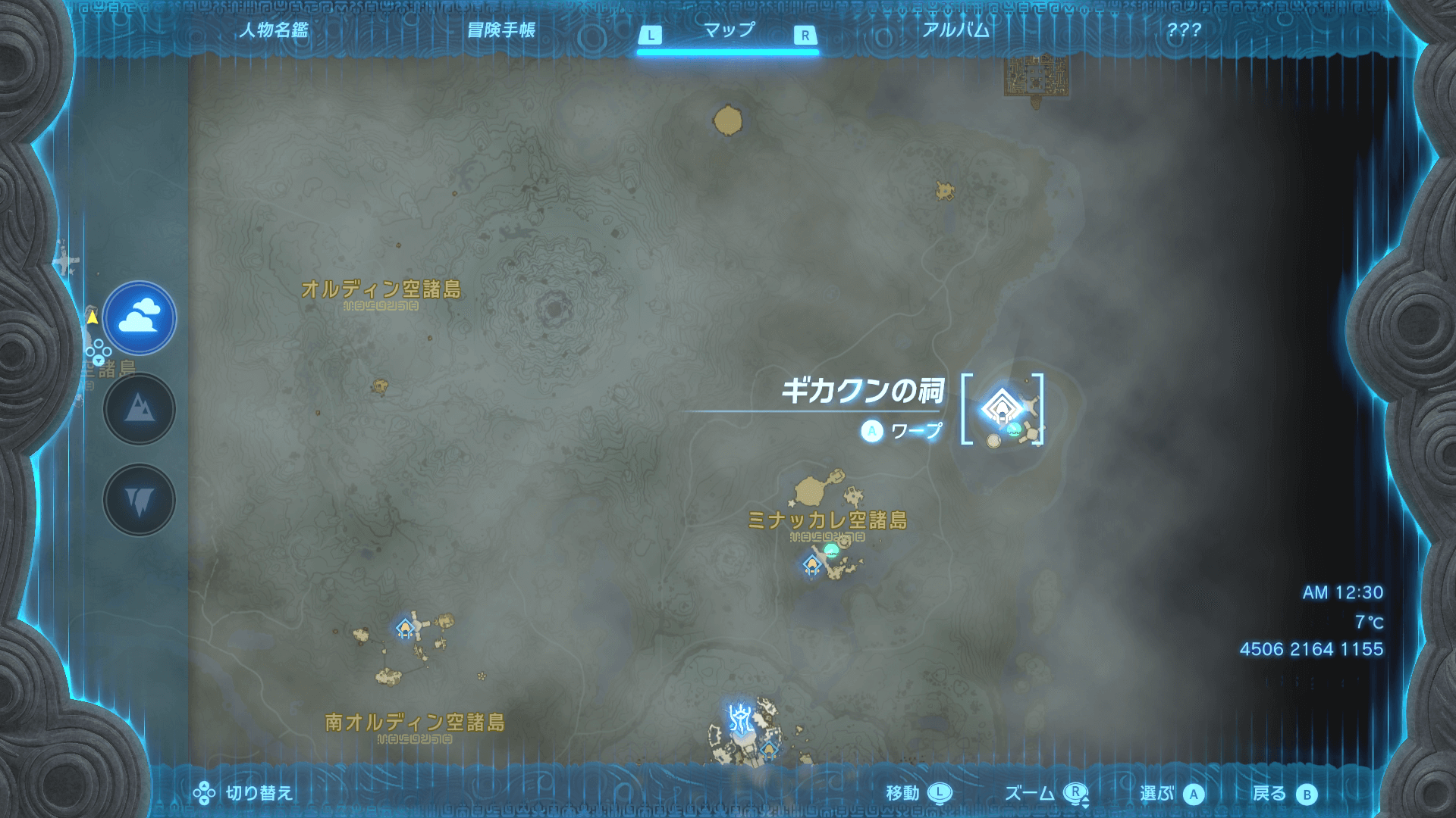 「ギカクンの祠」へは、近くの「ウルリ山鳥望台」から南にジャンプして、ミナッカレ空諸島の高度が低い島目指そう。なお、高度が低い空島は、南を向けば簡単に見つけられるため、パラセールを開く前に周囲を見渡して探すと良い。