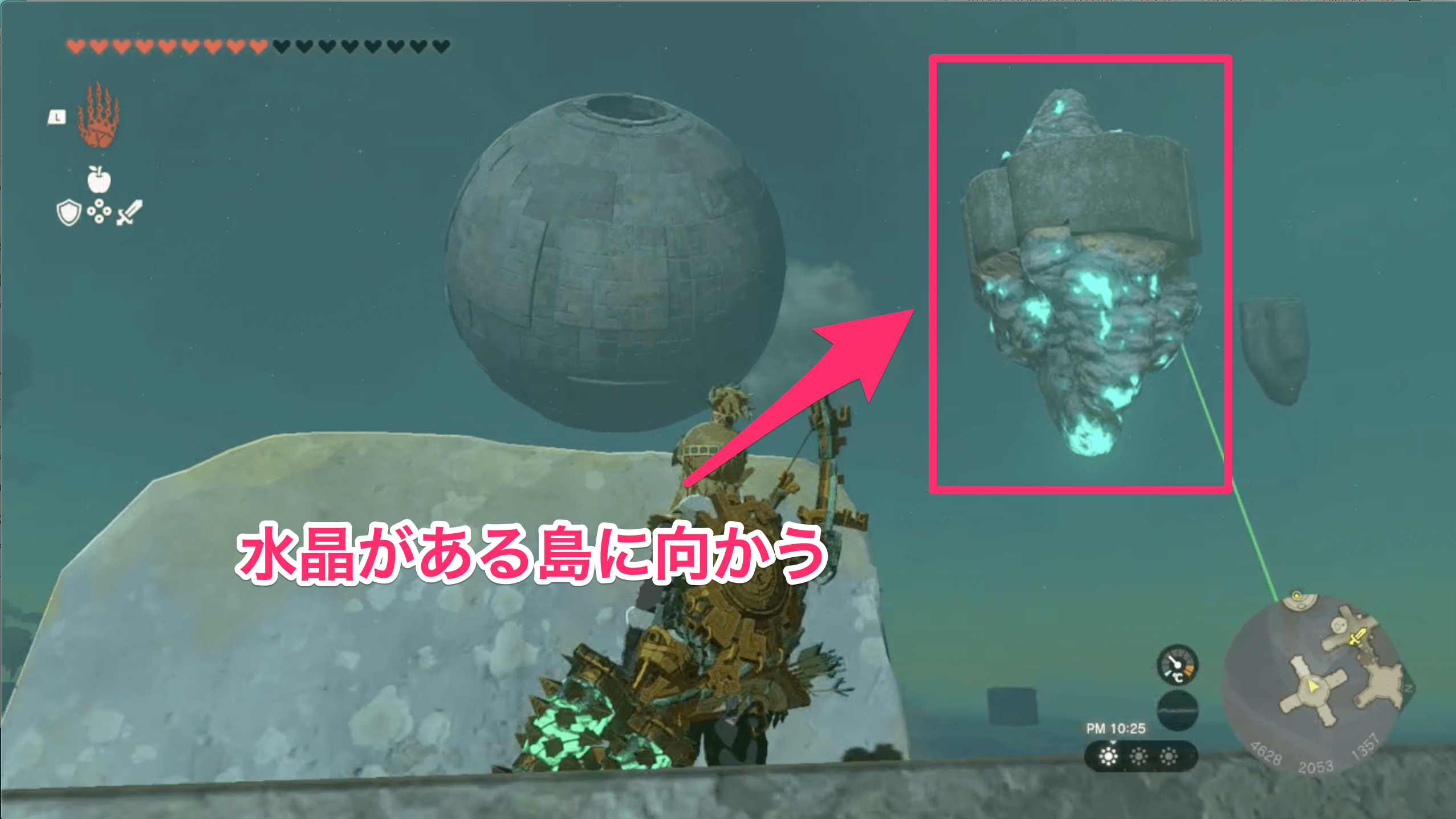 発射台を使って球体の近くにある水晶がある空島に着いたら、水晶を真下の祠がある空島に落とそう。祠のある空島は、真下にあるものの、確実に水晶を落とすために事前に空島の位置を確認しておくのがおすすめ。