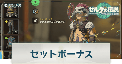 ゼルダの伝説ティアーズオブザキングダム(ティアキン/totk)のセットボーナス(セット効果)を掲載。セットボーナスの一覧をはじめ、用途毎のおすすめセットボーナスなどについても紹介しています。