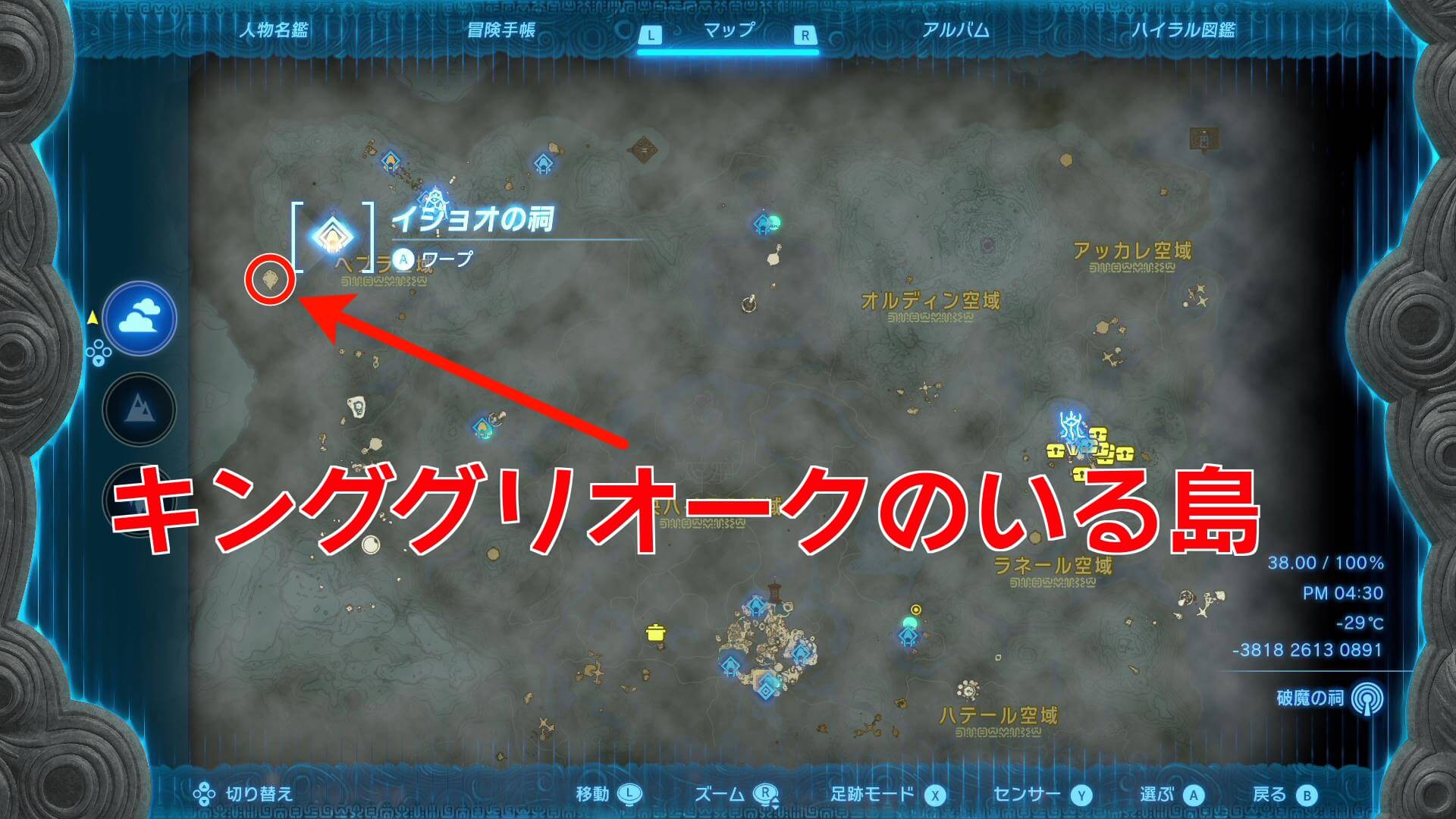 キンググリオークは、ヘブラ地方の空島の離れ小島にいる。鳥望台などを使っても一気に島までは行けないため、ゾナウギアを確保するなど準備をしてから撮影しに行こう。