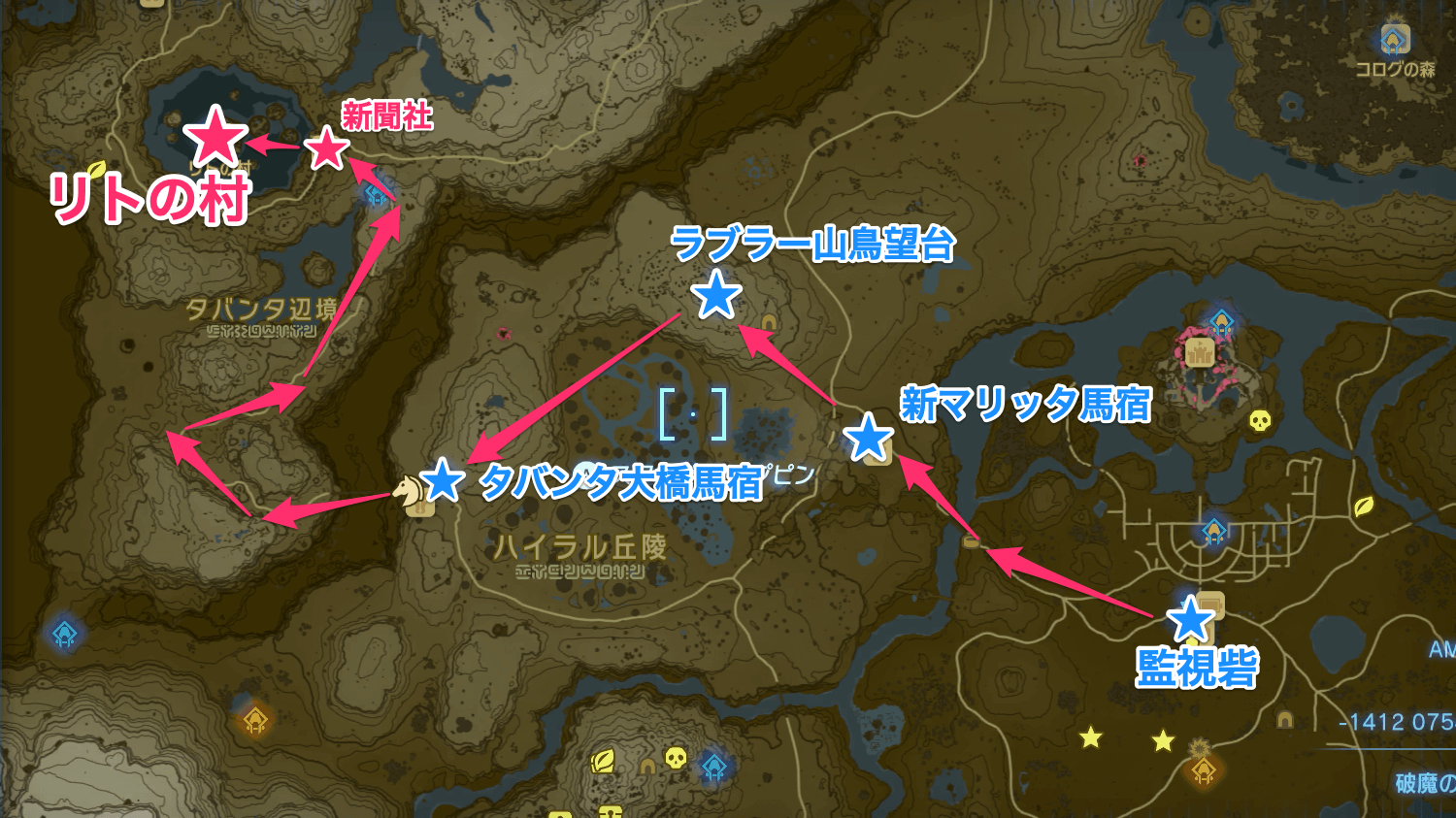 カロク橋を抜けた後は目の前にある「新マリッタ馬宿」と祠を調べ、北西にある「ラブラー山鳥望台」も解放しておこう。解放後は鳥望台で飛んでそのまま南西にある「タバンタ大橋馬宿」に向かえば、リトの村を目指しつつマップ西側の中継地点を効率良く埋められる。
