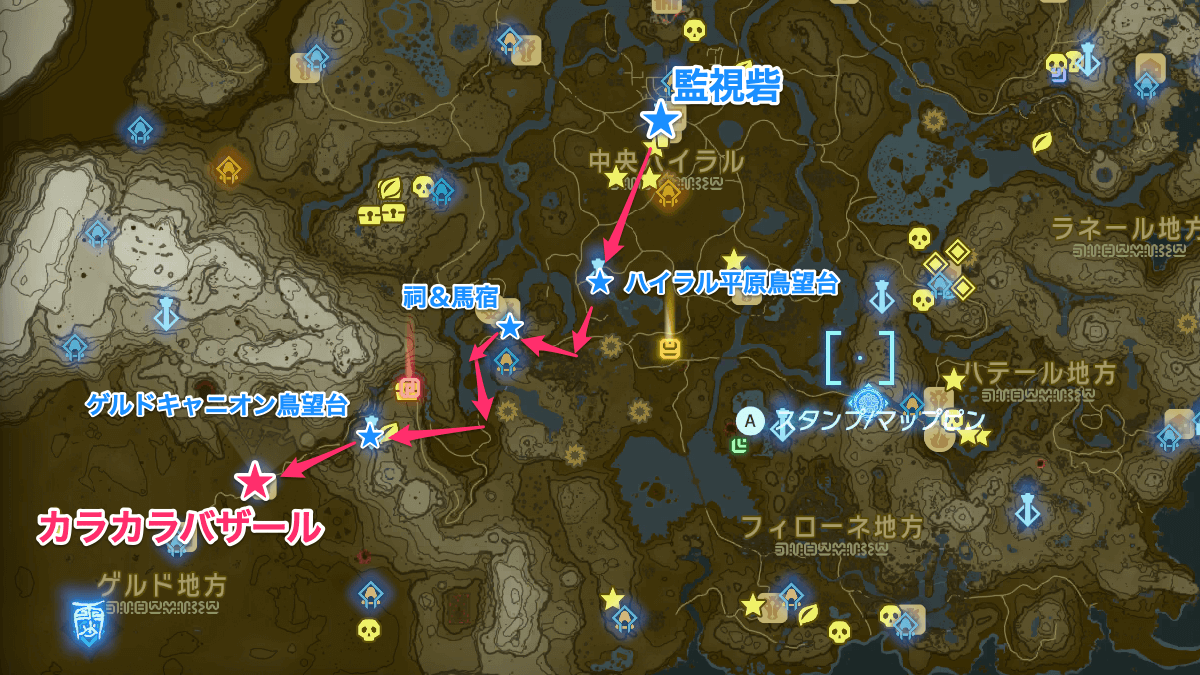ゲルドキャニオン鳥望台から南西に進めば、目的地のカラカラバザールに辿り着く。さらに南西に進めばゲルドの街にも向かえるが、周辺は敵が強力で気候も激しいため、バザール内で装備や料理の準備をしておこう。