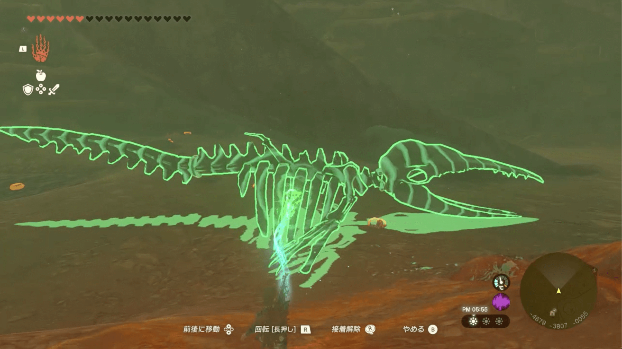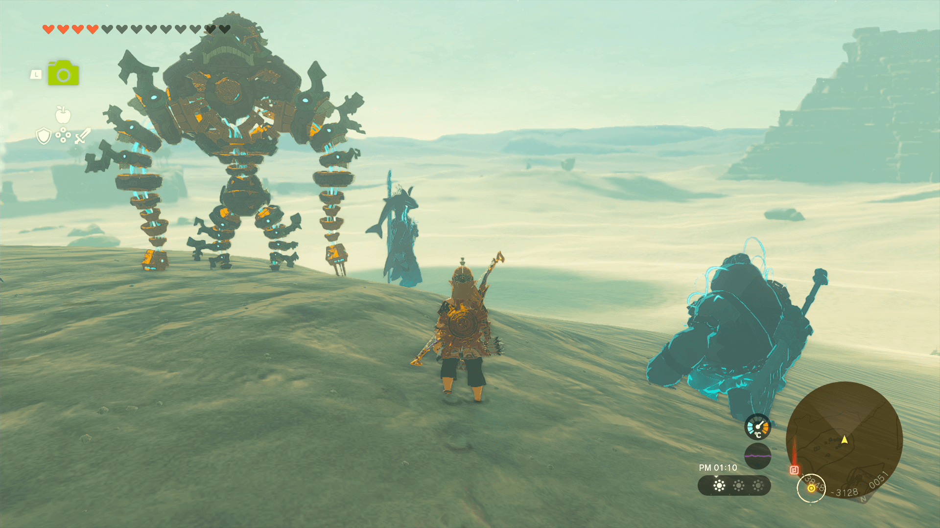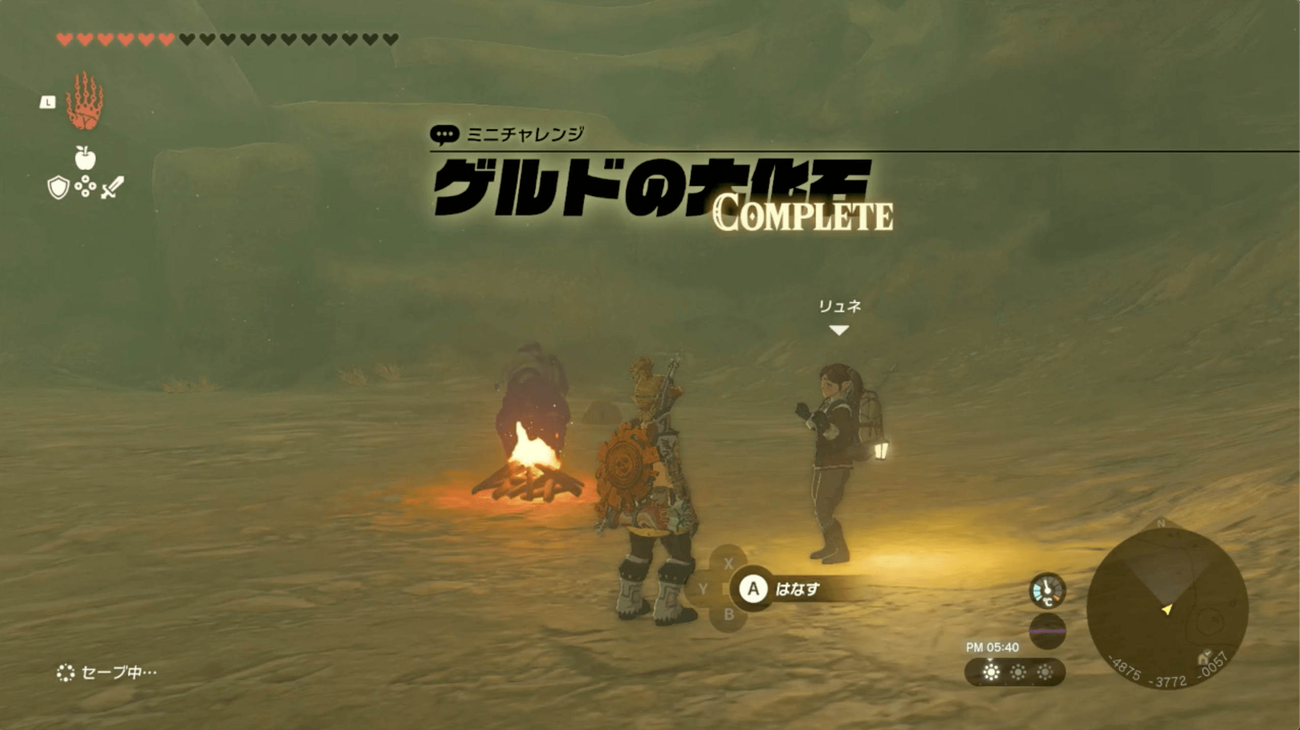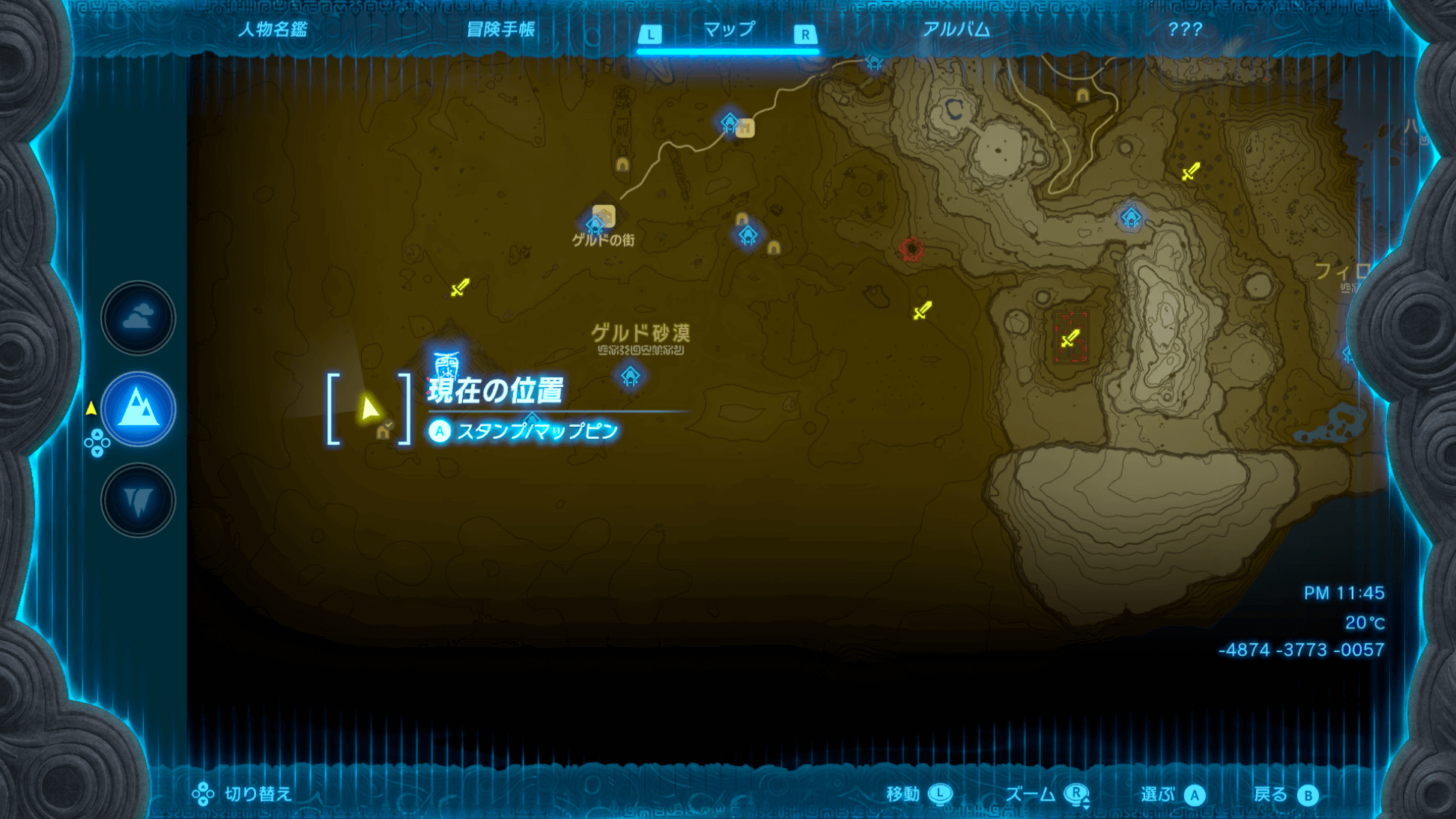 「ゲルドの大化石」があるゲルド砂漠は、ストーリーで「雷の神殿」をクリアするまで砂塵が吹き荒れており、マップを開いても自分の場所が分からない。そのため、先にストーリーを進めて雷の神殿をクリアしてから、挑戦しよう。