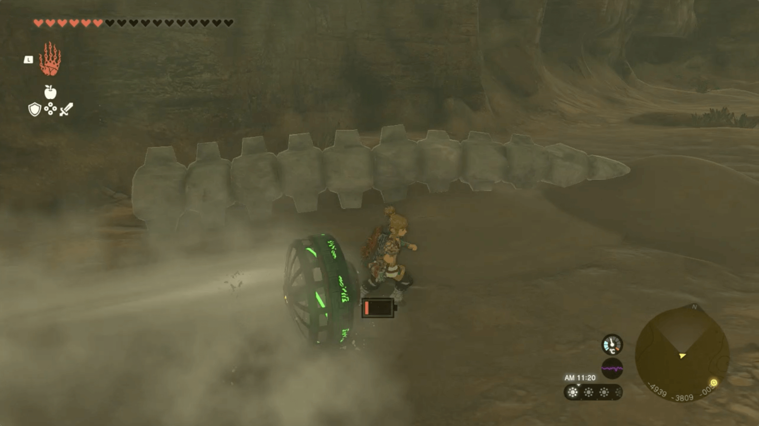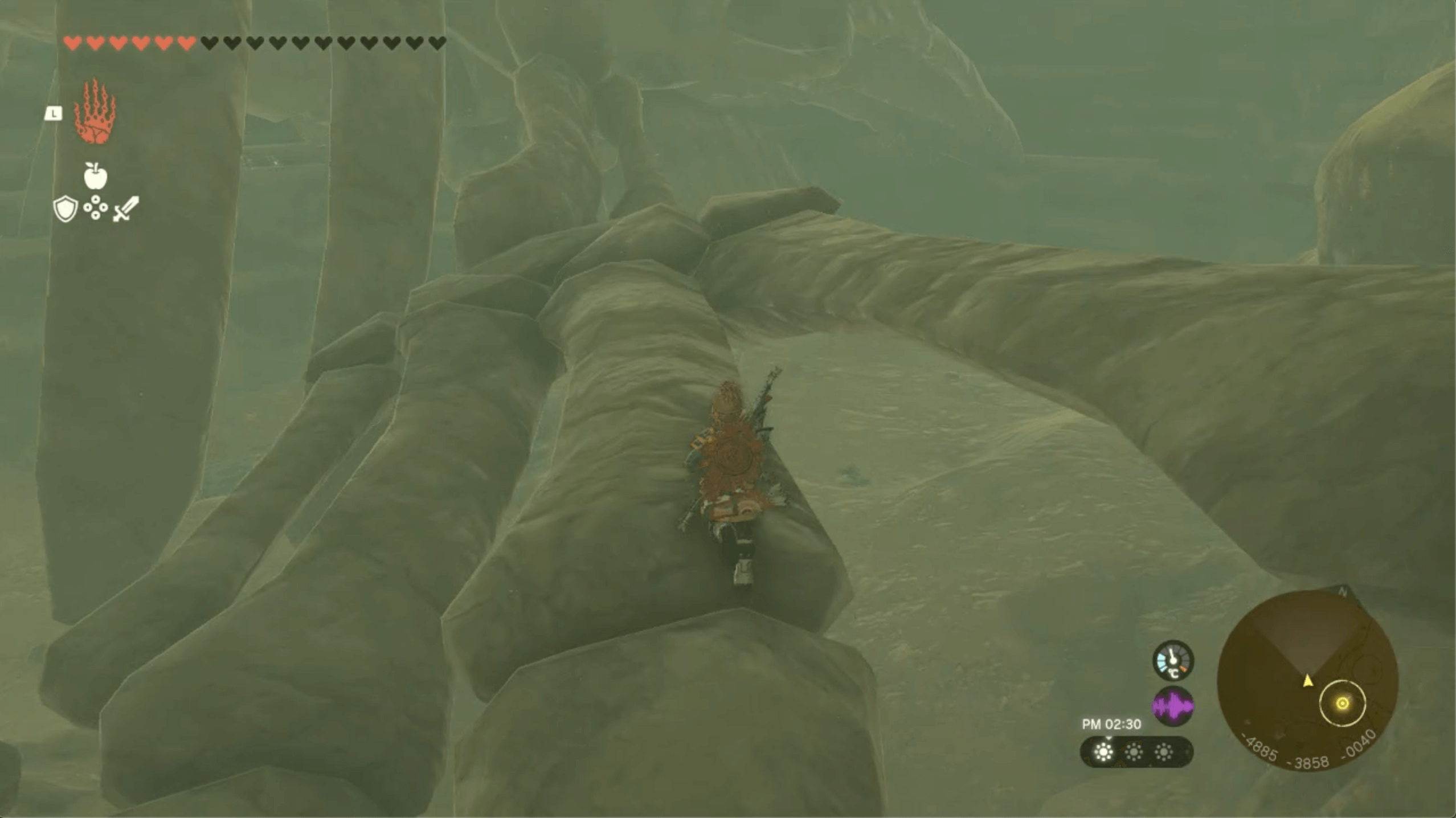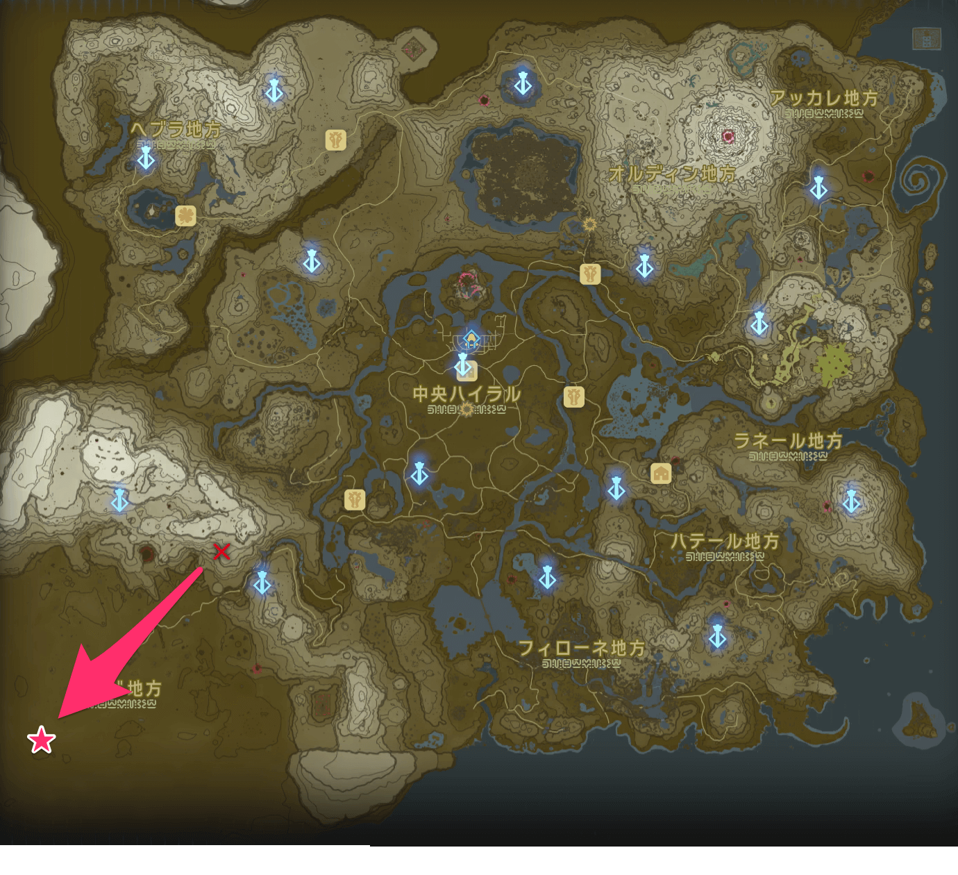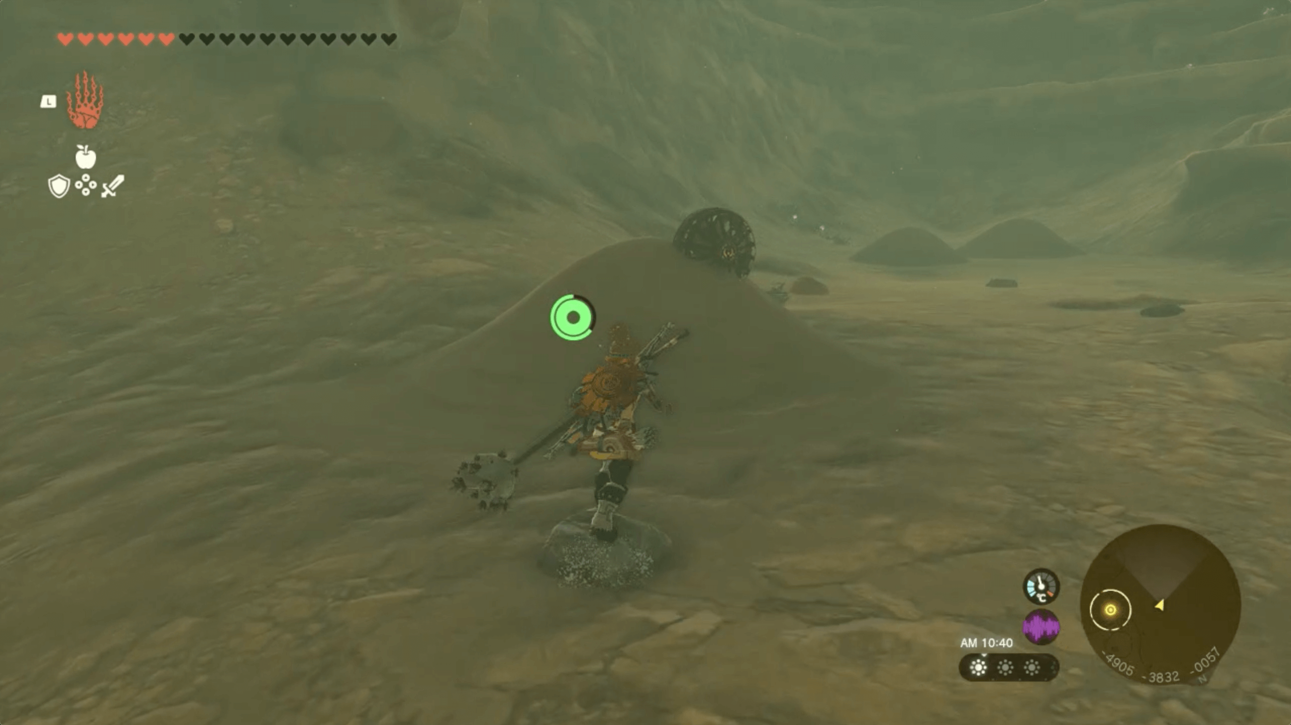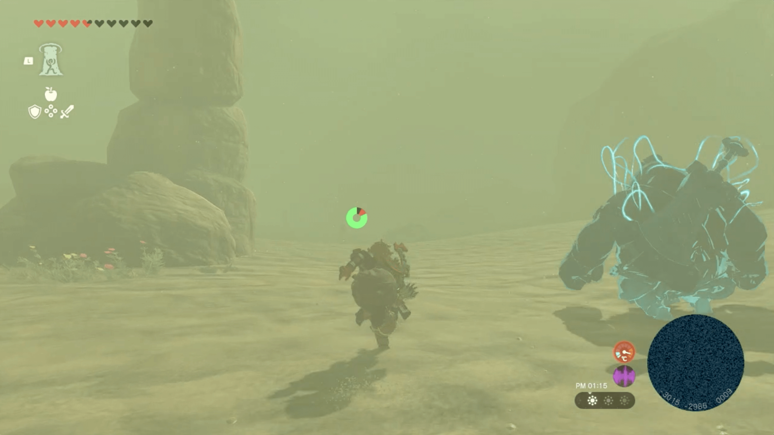 「ゲルドの大化石」があるゲルド砂漠は、ストーリーで「雷の神殿」をクリアするまで砂塵が吹き荒れており、マップを開いても自分の場所が分からない。そのため、先にストーリーを進めて雷の神殿をクリアしてから、挑戦しよう。
