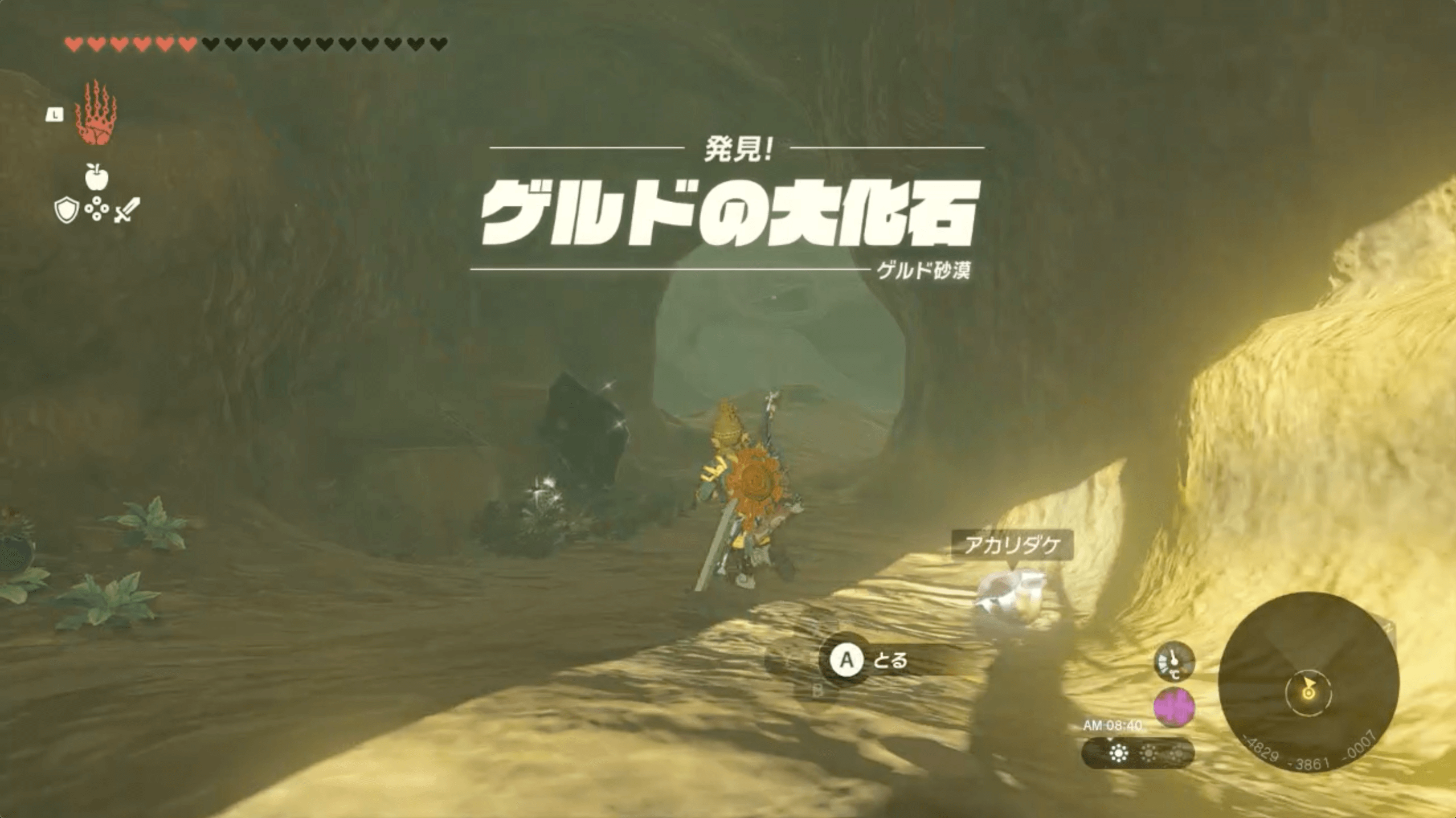 ゲルド砂漠を南西に進んで雷の神殿裏に行くと、「ゲルドの大化石」がある洞窟が見えてくる。比較的簡単に見つけられるが、もし見つからなかったら、マップを開いて目的地を確認しよう。