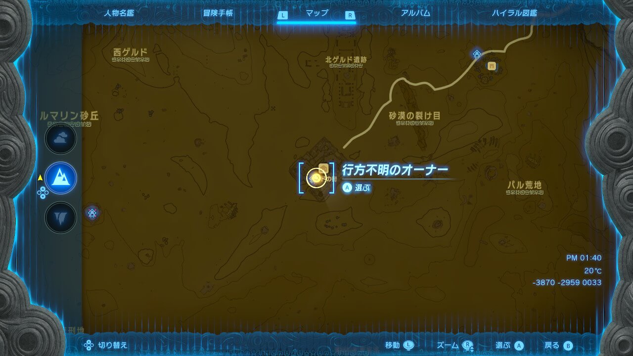 「行方不明のオーナー」は、ゲルドの街に到着した時点で受注できるが、オーナーを探しに行くのは雷の神殿クリア後がおすすめだ。神殿をクリアするまでは砂嵐の影響で砂漠を移動しづらく、周囲の把握も難しいため、先に神殿をクリアして晴れた状態にしておこう。