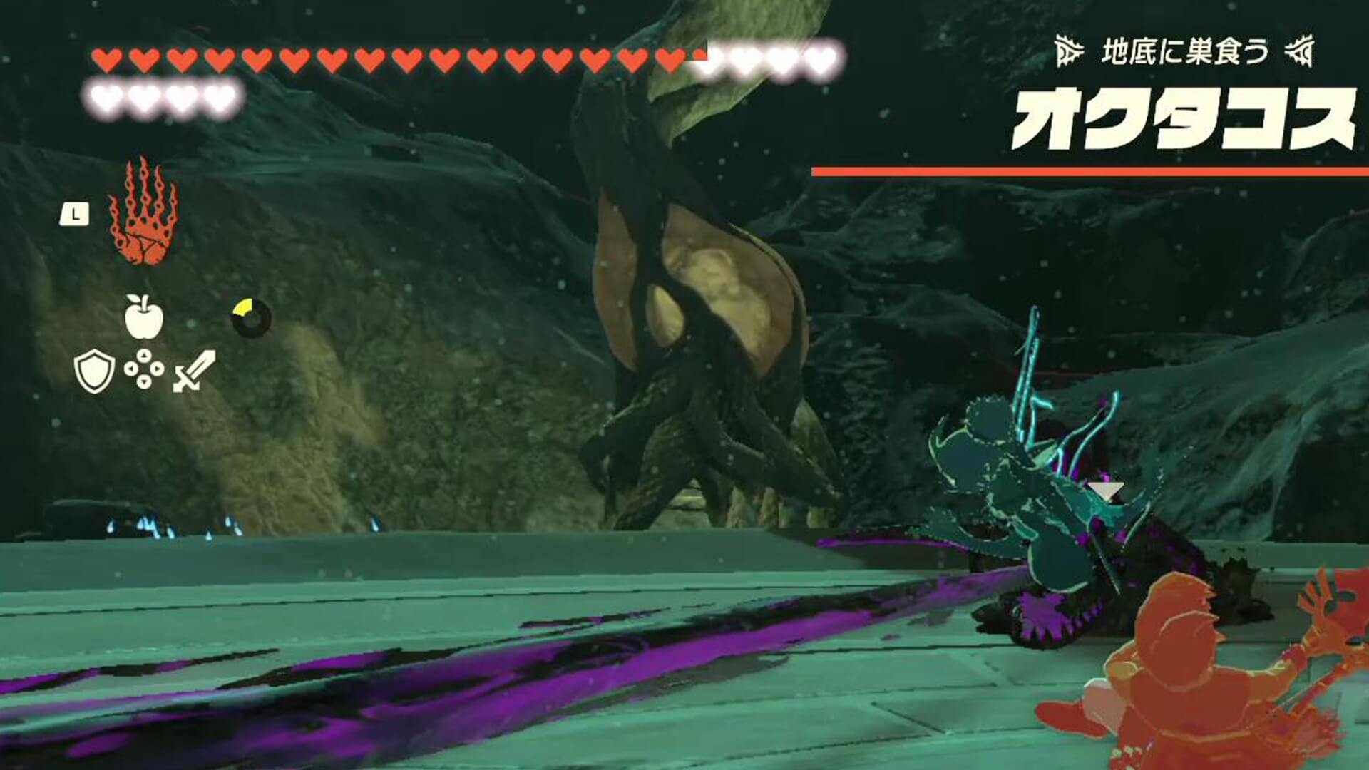 地底のオクタコスは、神殿で戦ったときよりも攻撃力が高い。防具を強化していない場合、一撃でより多くのダメージを受けるようになったため、攻撃を受けないよう立ち回るのが大事になってくる。