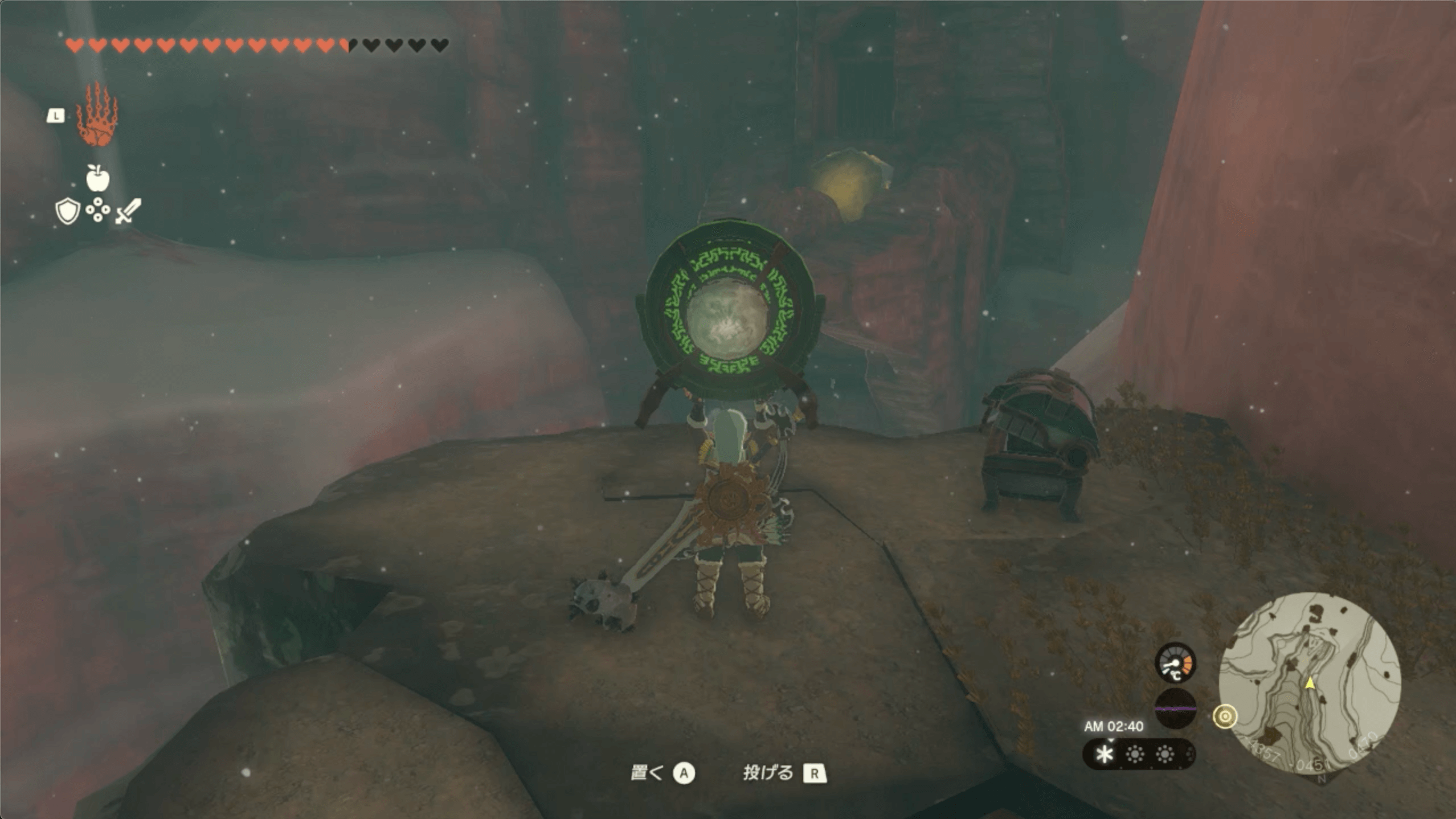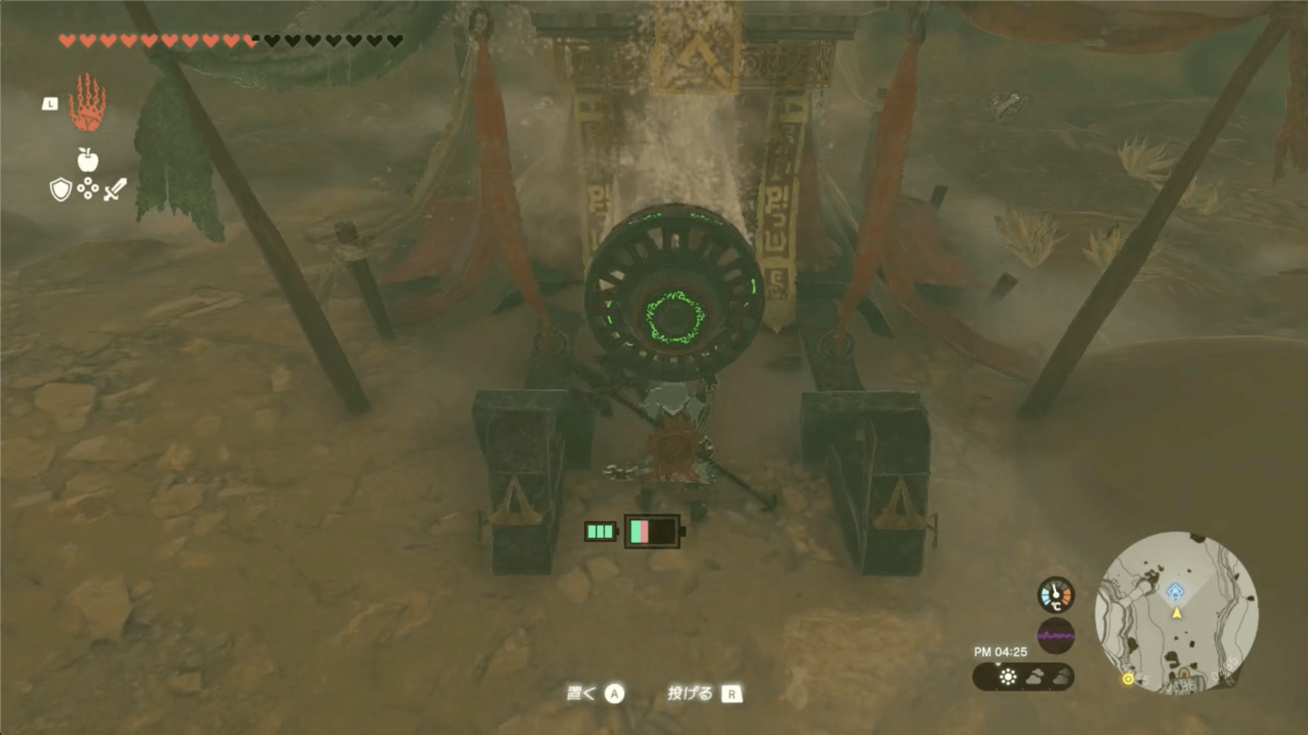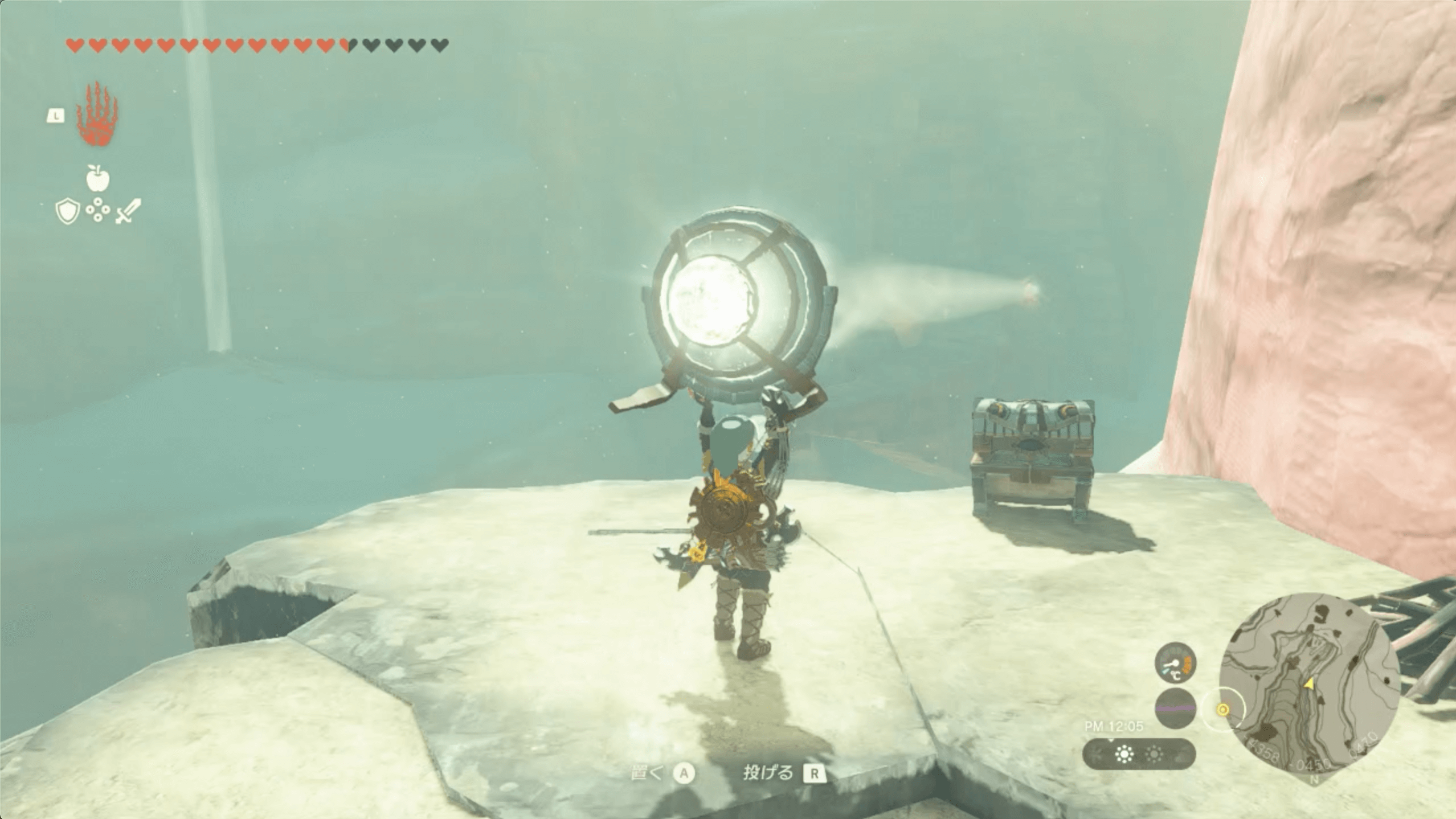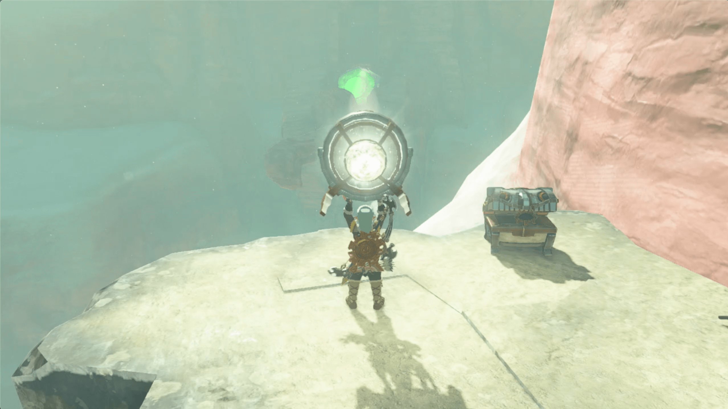 ゲルド山頂の近くにある「八人目の英雄像」に到着したら、鏡で太陽の光を反射させて、南にあるセンサーに当てよう。なお、太陽の光は、昼に晴れている時にしか射さないため、崖上で火を起こして時間を進めると良い。