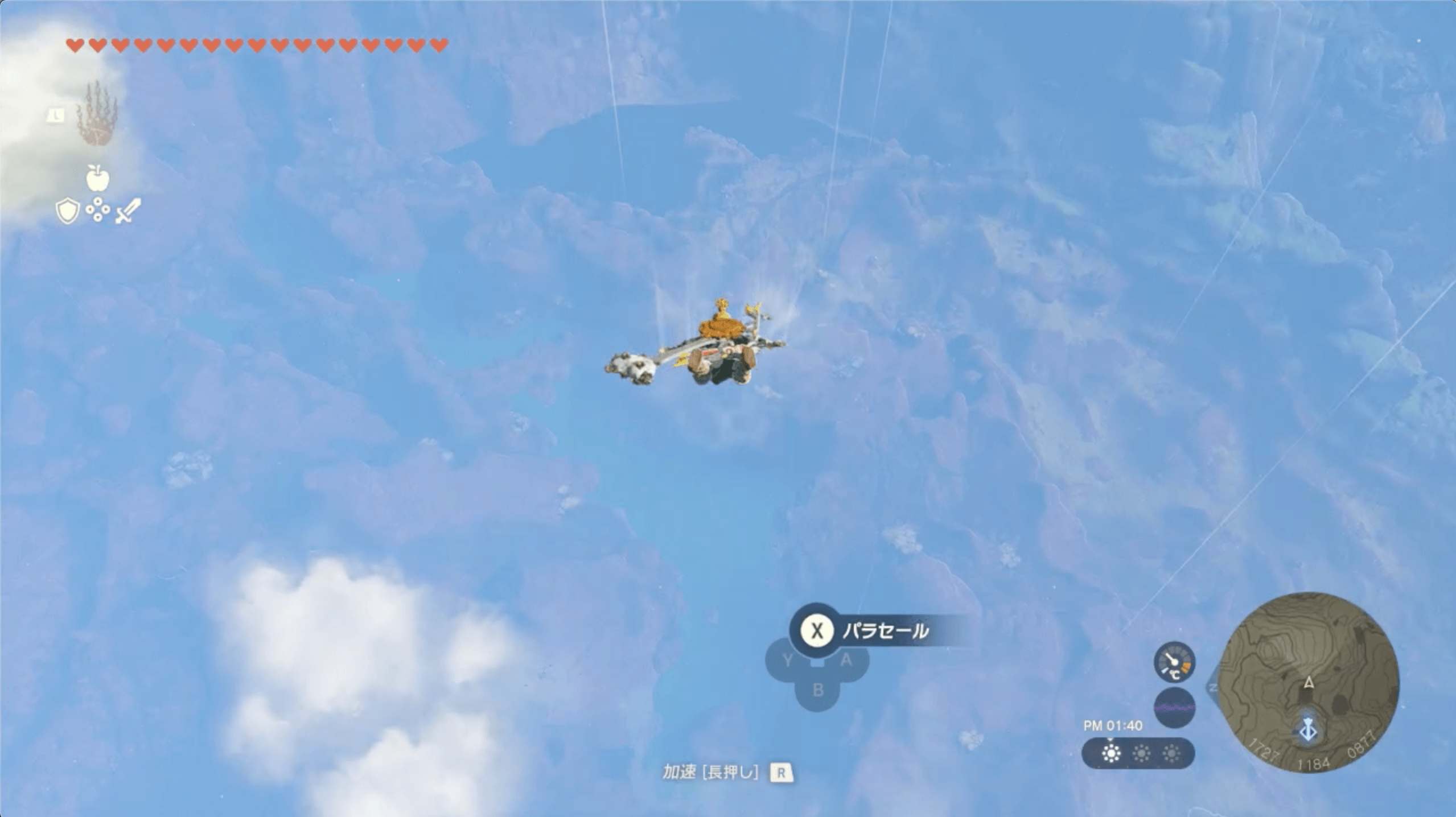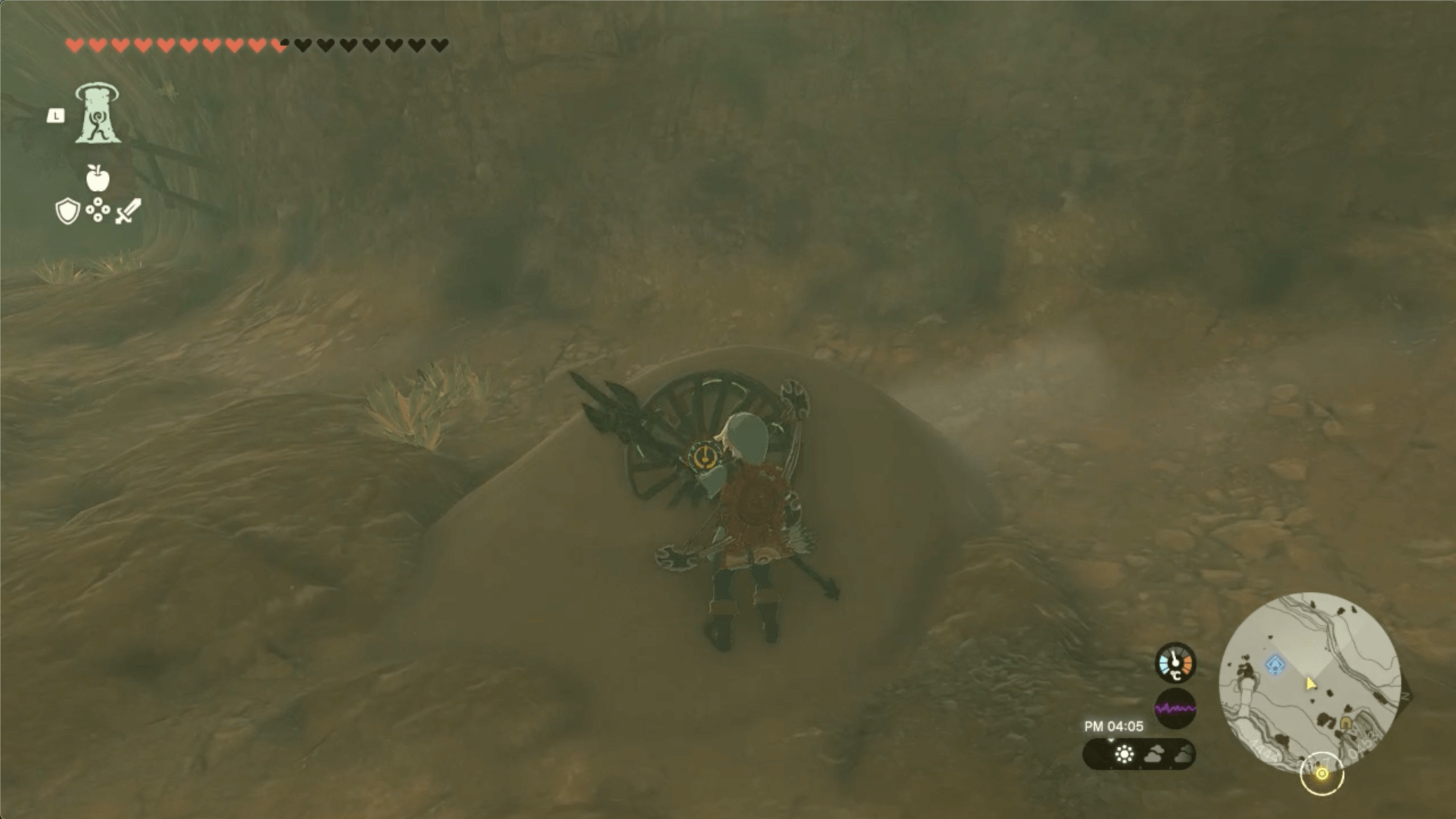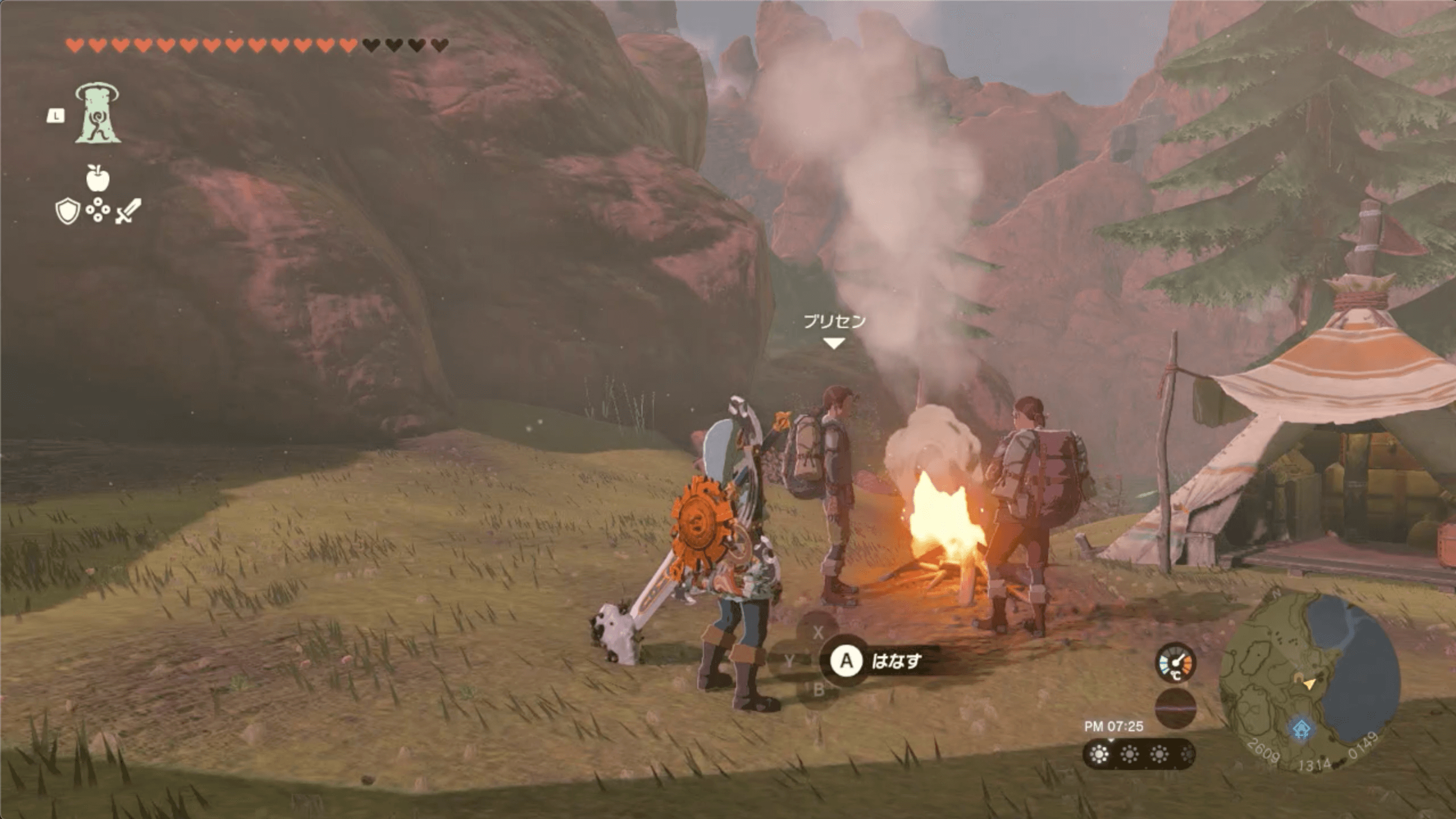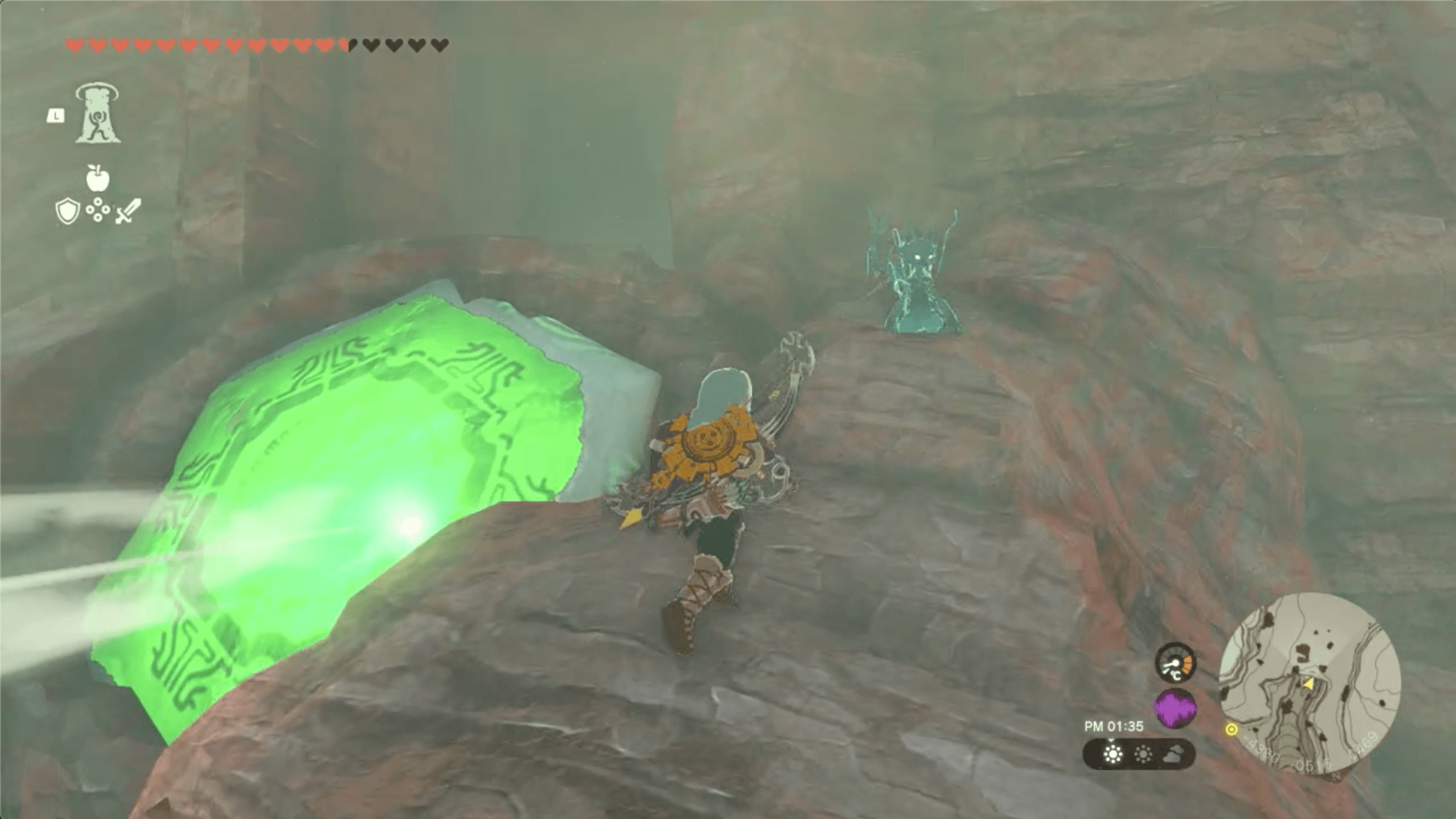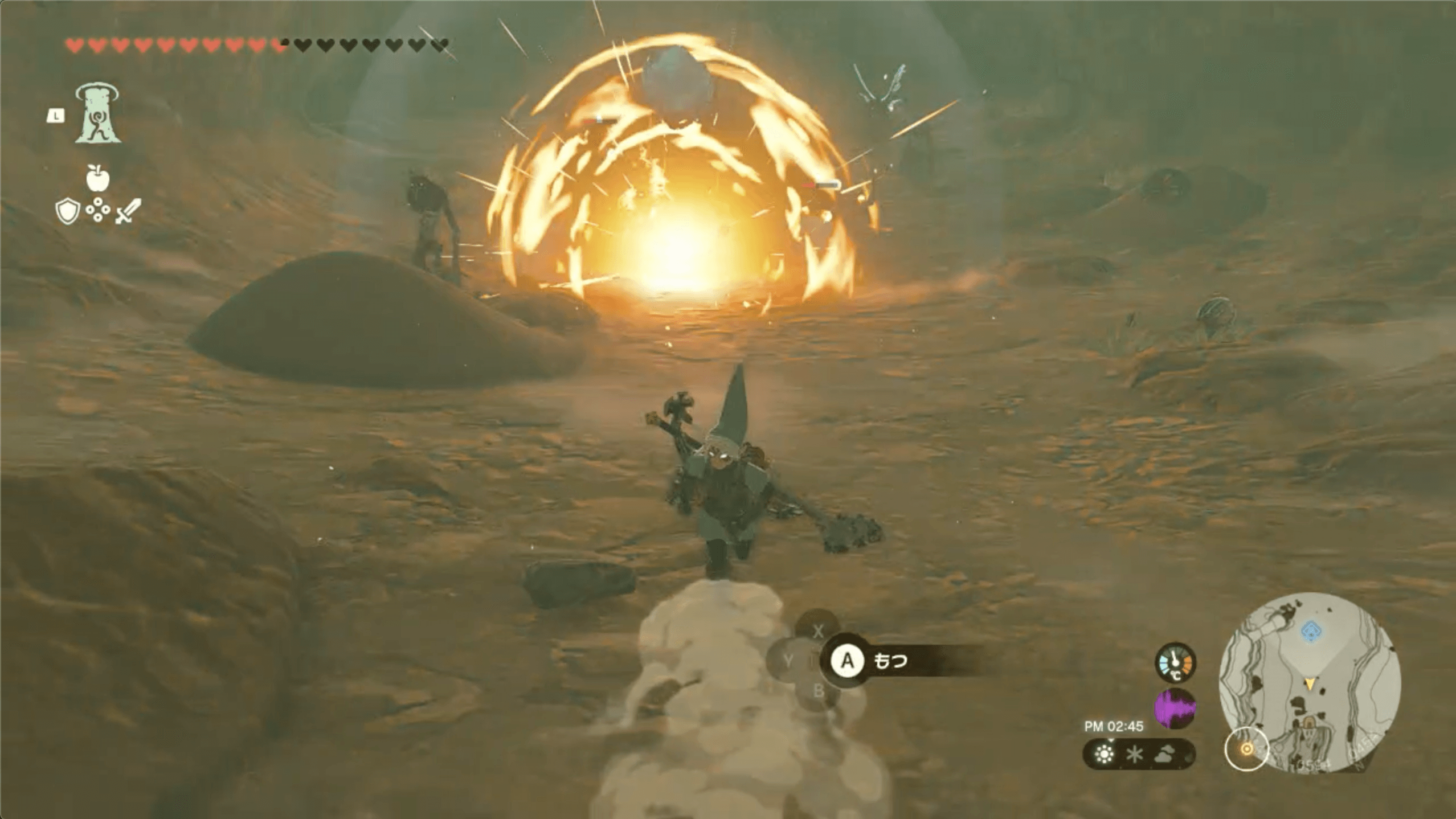 ゲルド山頂の近くにある「八人目の英雄像」に到着したら、鏡で太陽の光を反射させて、南にあるセンサーに当てよう。なお、太陽の光は、昼に晴れている時にしか射さないため、崖上で火を起こして時間を進めると良い。