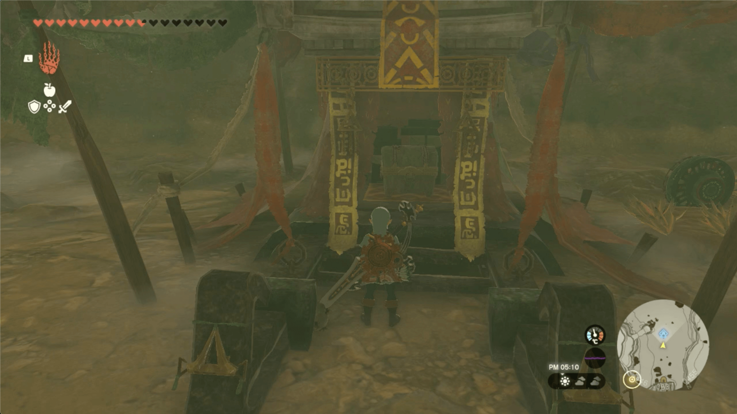 祭壇の砂を扇風機で吹き飛ばすと、宝箱を回収できる。宝箱の中には、夜の間移動速度が上がるセット効果がある「チンクルの頭巾」を入手できる。そのため、他のチンクル防具も集めて、セット効果を発動させよう。