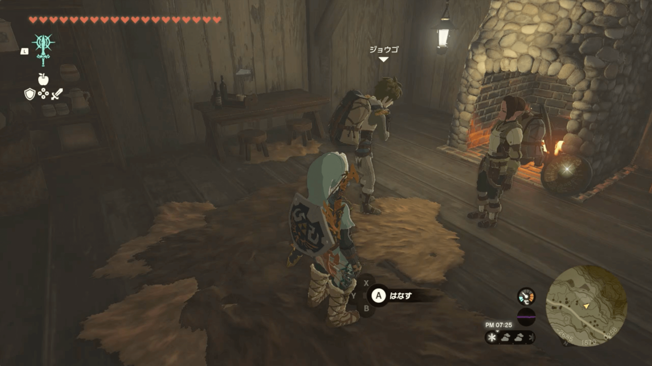 魔物を倒して、小屋に入って「ジョウゴ」と「ヤム」と話したら、報酬の「ピリ辛薬」をもらいつつ、盾サーフィンのやり方を教えてもらえる。盾サーフィンは、坂道を走るよりも速く下れるようになるため、近くの坂道で練習してみよう。
