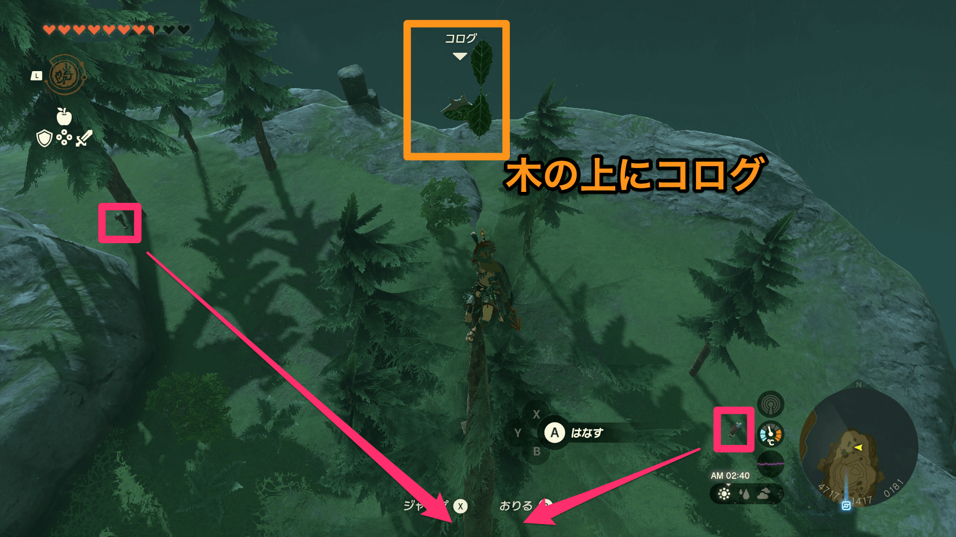 ▲画像の場合は矢印の交わる木の上にコログが出現