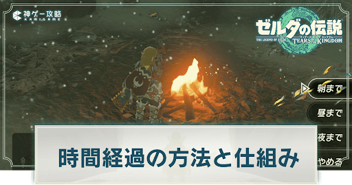 ゼルダの伝説ティアーズオブザキングダム(ティアキン/totk)の時間経過の方法と仕組みを掲載。赤い月や素材復活のタイミングについても紹介しています。