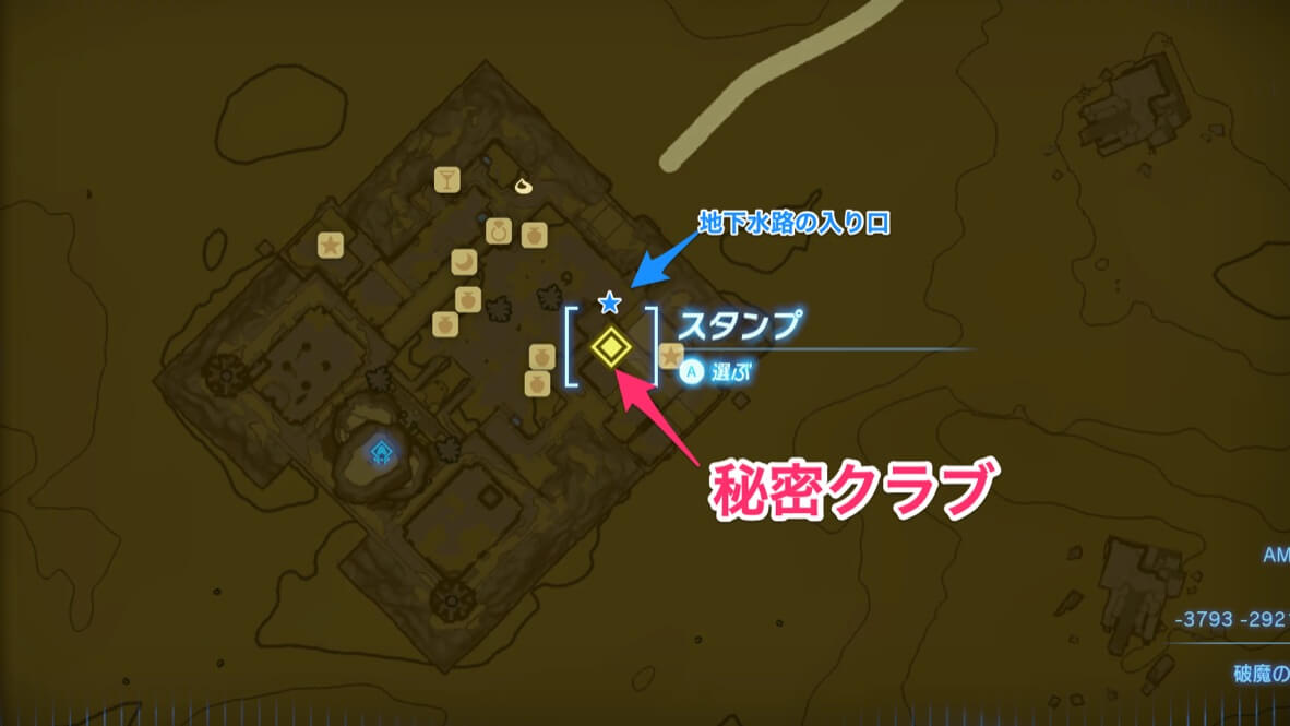 「秘密クラブ」に侵入するには、まずゲルドの街北東にある北門付近から水路に飛び込もう。水路の途中にある壁穴をLスティック押し込みでしゃがんで潜り、柱が立っている位置でトーレルーフを使えば店内に入れる。