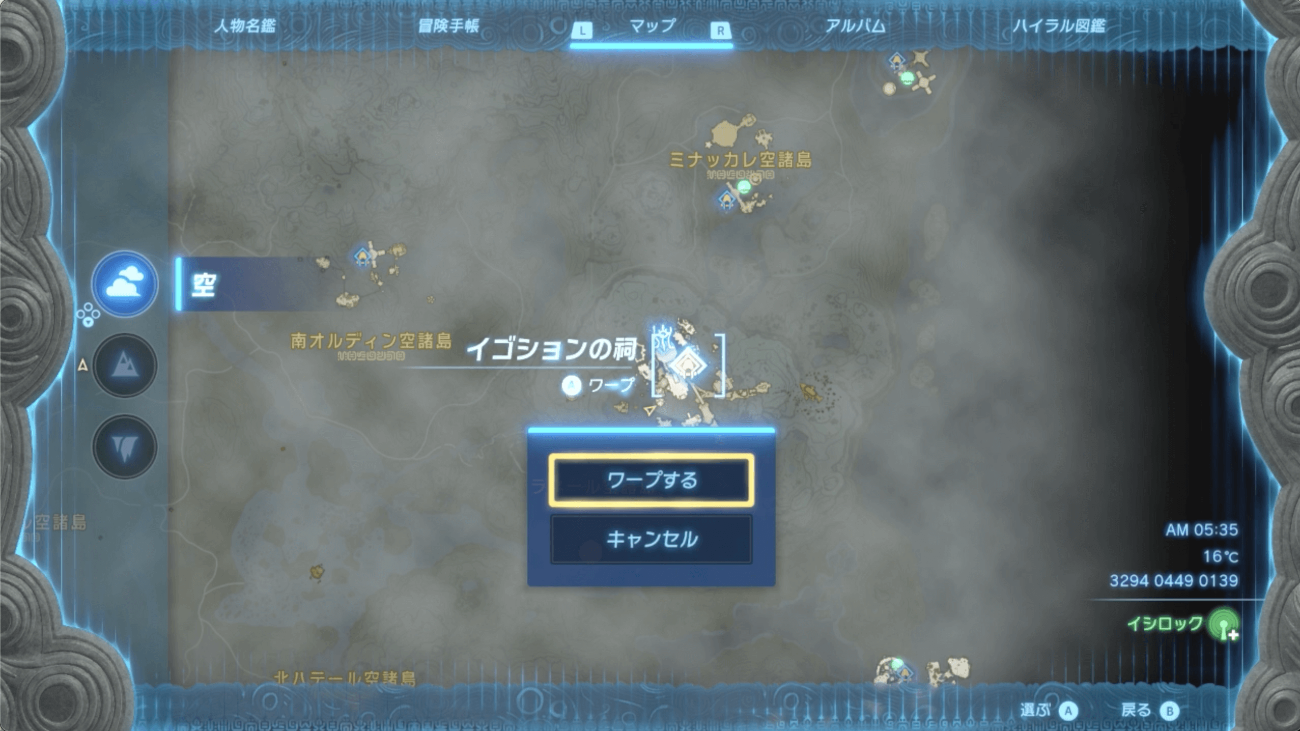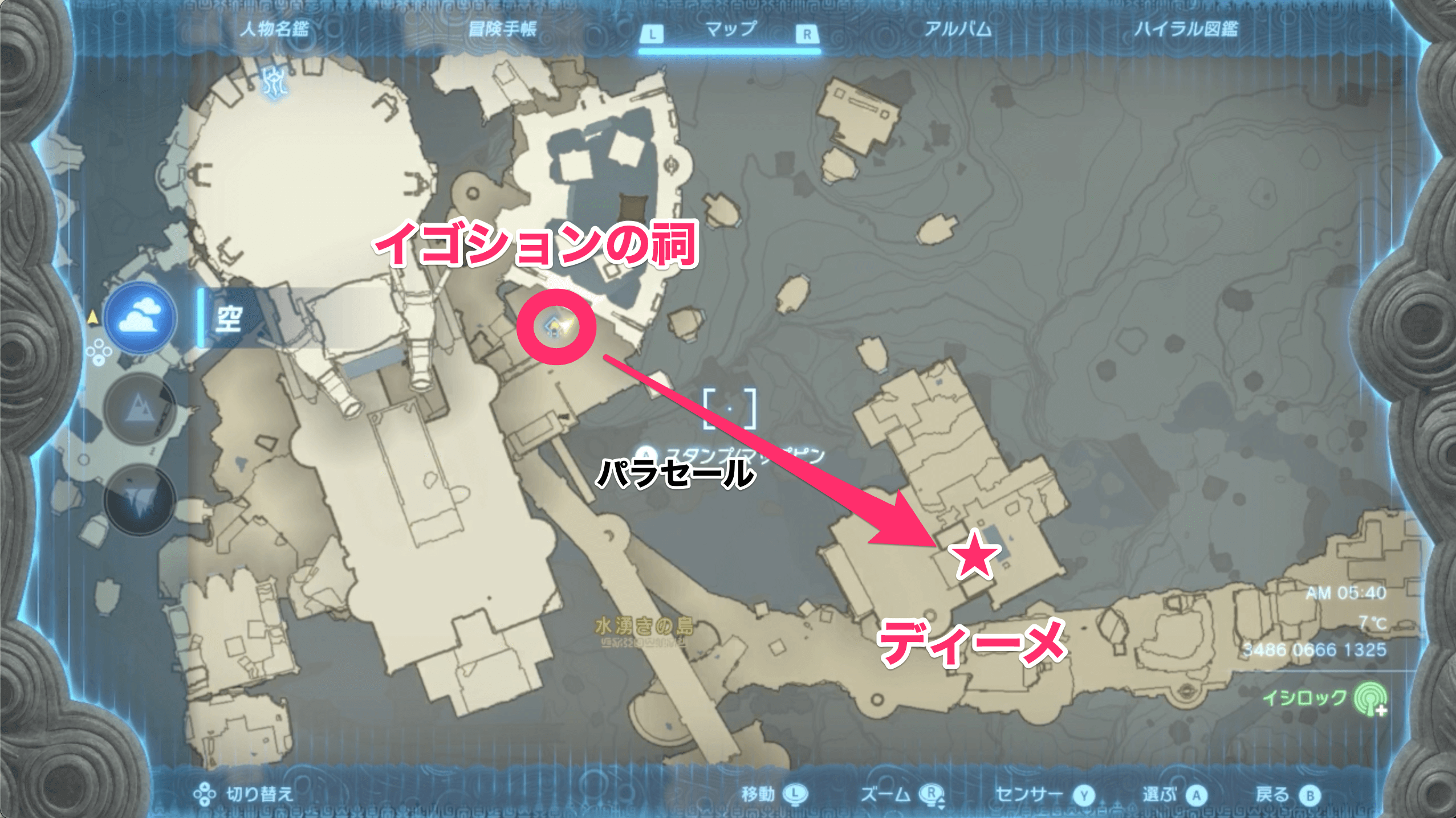 ディーメがいる島は、イゴションの祠がある島から滑空するとすぐに辿り着ける。あらかじめイゴションの祠を解放しておき、チャレンジを受注したらワープしてディーメのもとへ向かおう。