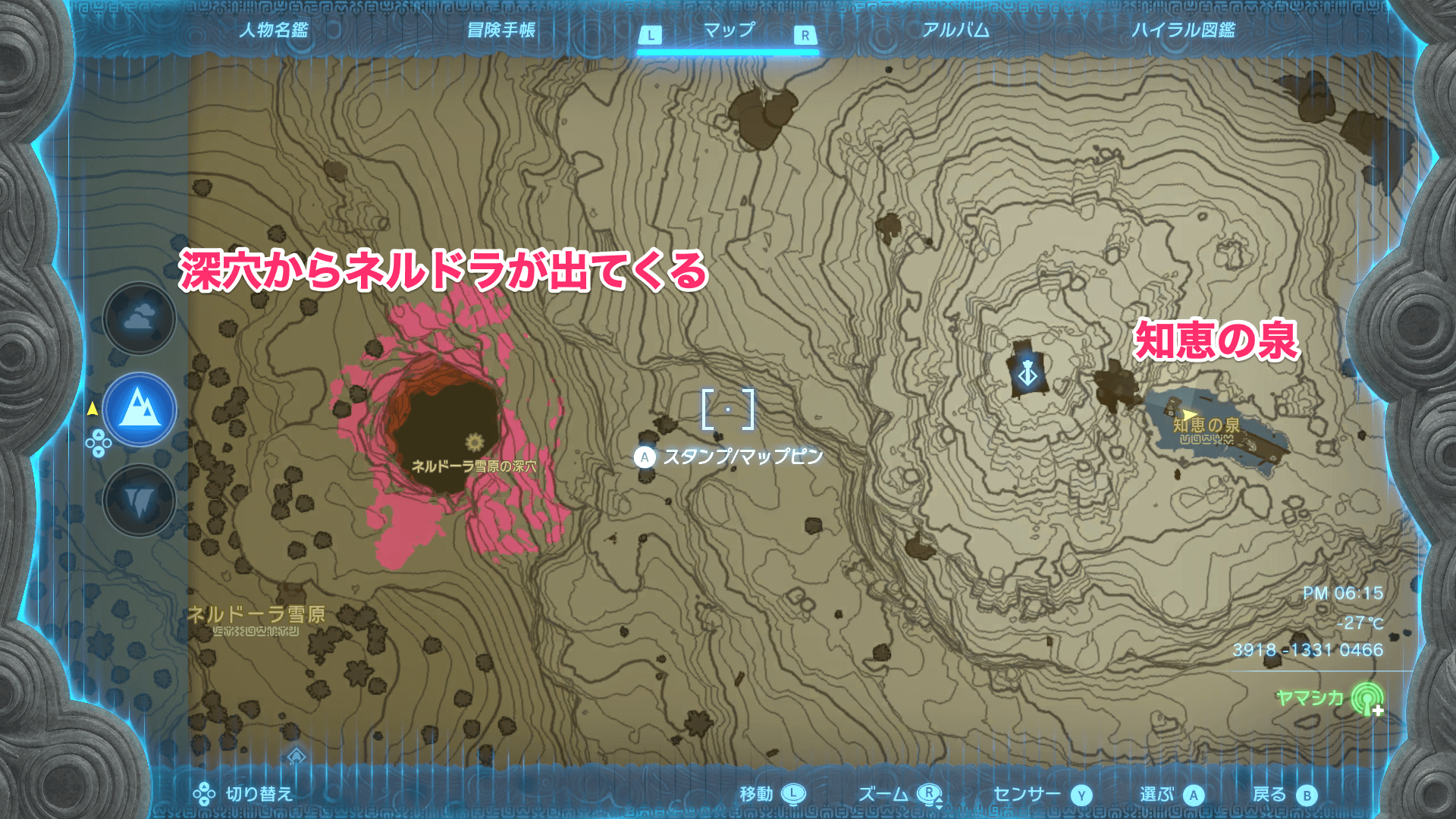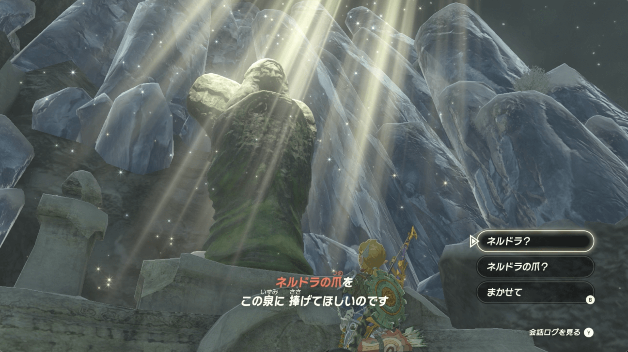 チャレンジクリアに必要な「ネルドラの爪」は、ハイラル中を徘徊しているネルドラから入手できる。徘徊中のネルドラに乗るのは難しいので、ネルドーラ雪原の深穴から出てくる瞬間に飛び乗るのがおすすめだ。ネルドーラ雪原は、知恵の泉から西へ進めばすぐに辿り着ける。