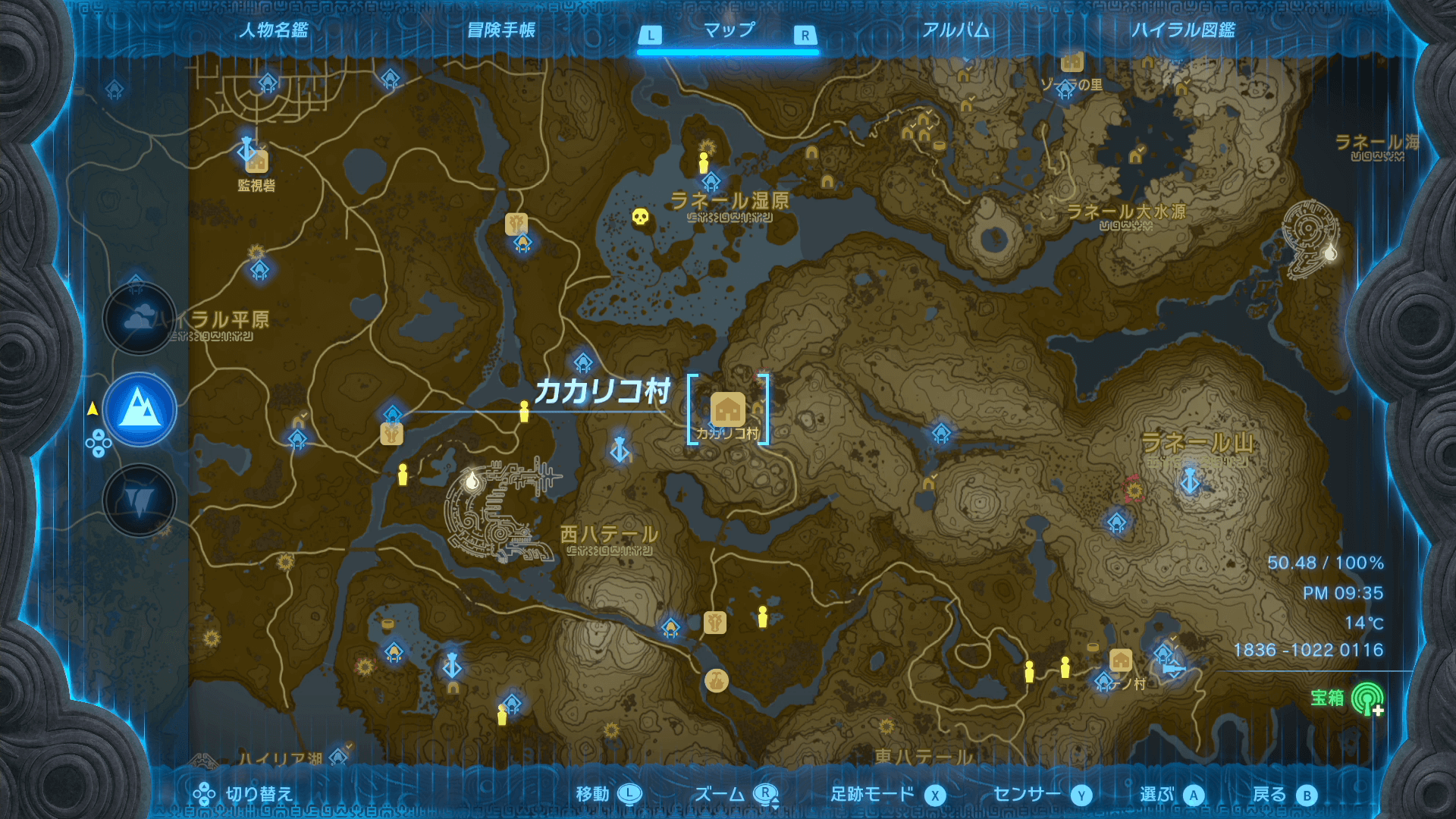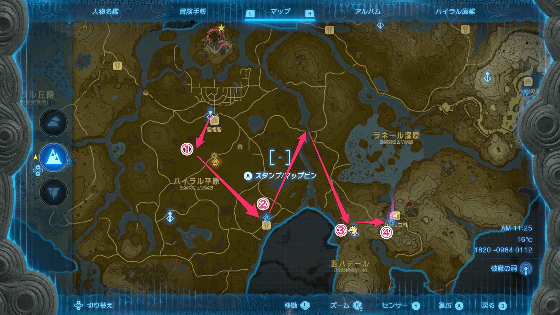 「帰らぬ宿屋」の受注場所のカカリコ村は、監視砦から南西で馬を捕まえて行くのがおすすめ。道中にある祠や鳥望台を解放しながら進んで、マップも同時に埋めていこう。