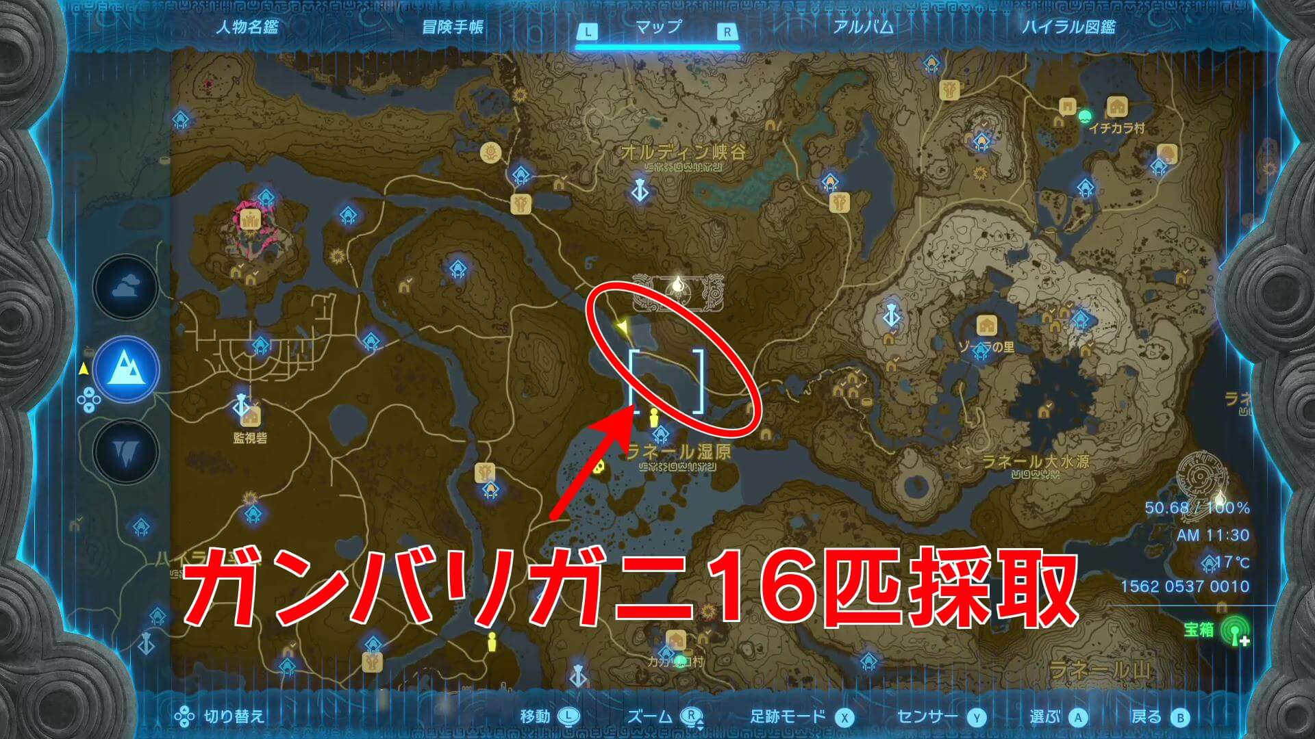 ガンバリガニは、ラネール湿原の道で集めるのがおすすめ。川沿いに歩けば、ガンバリガニが16匹いるため、必要な10匹をすぐに集められる。