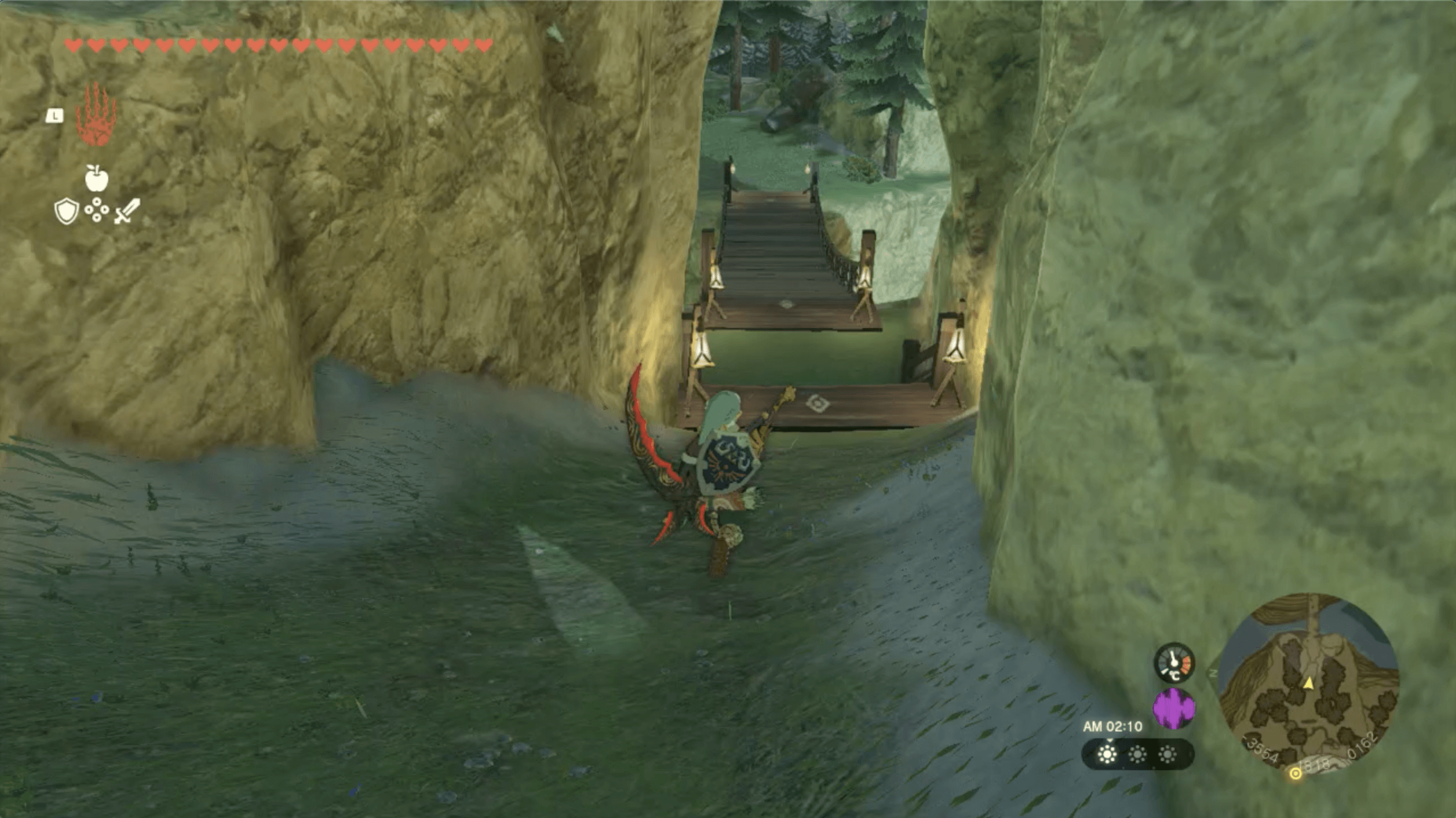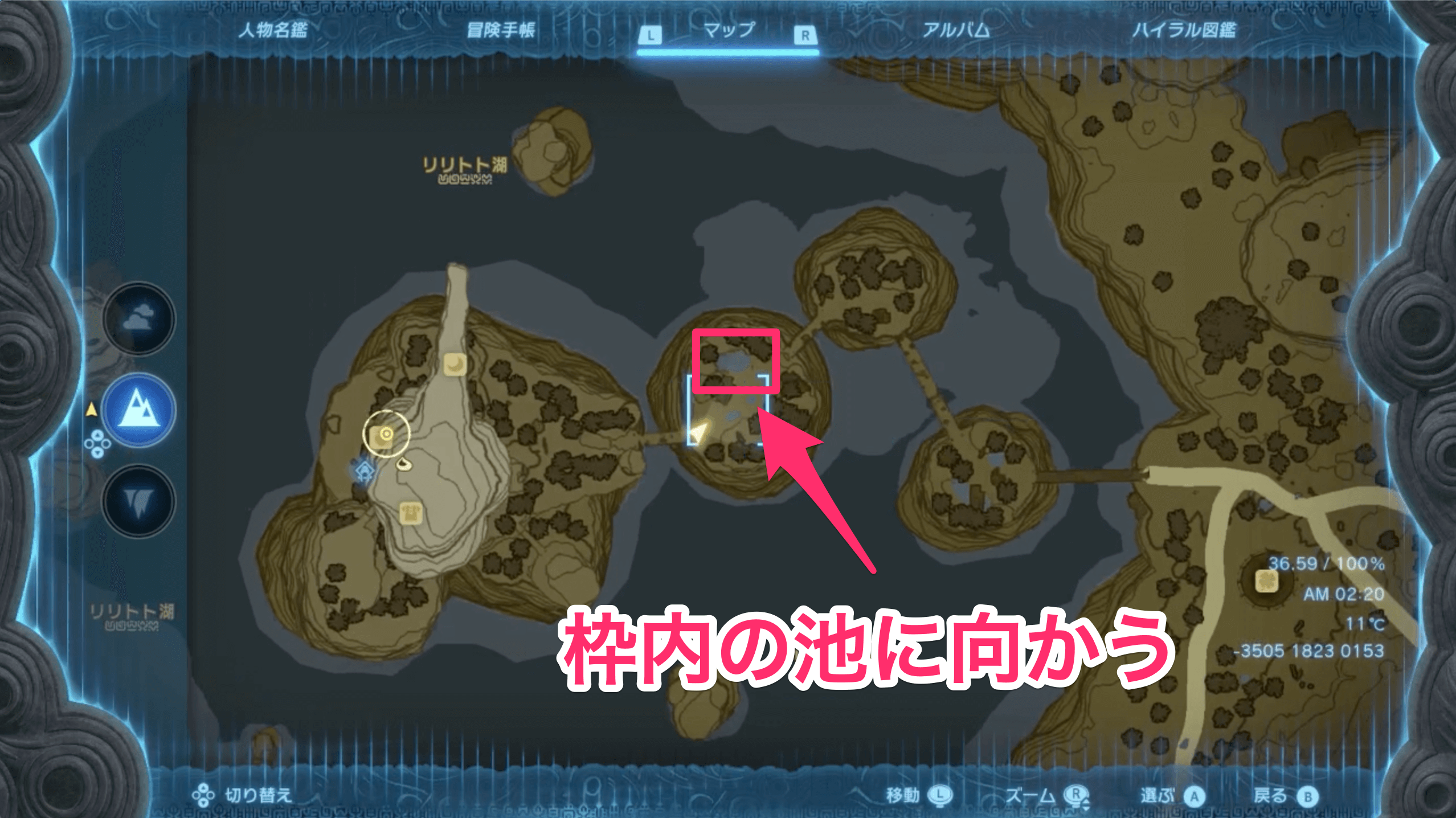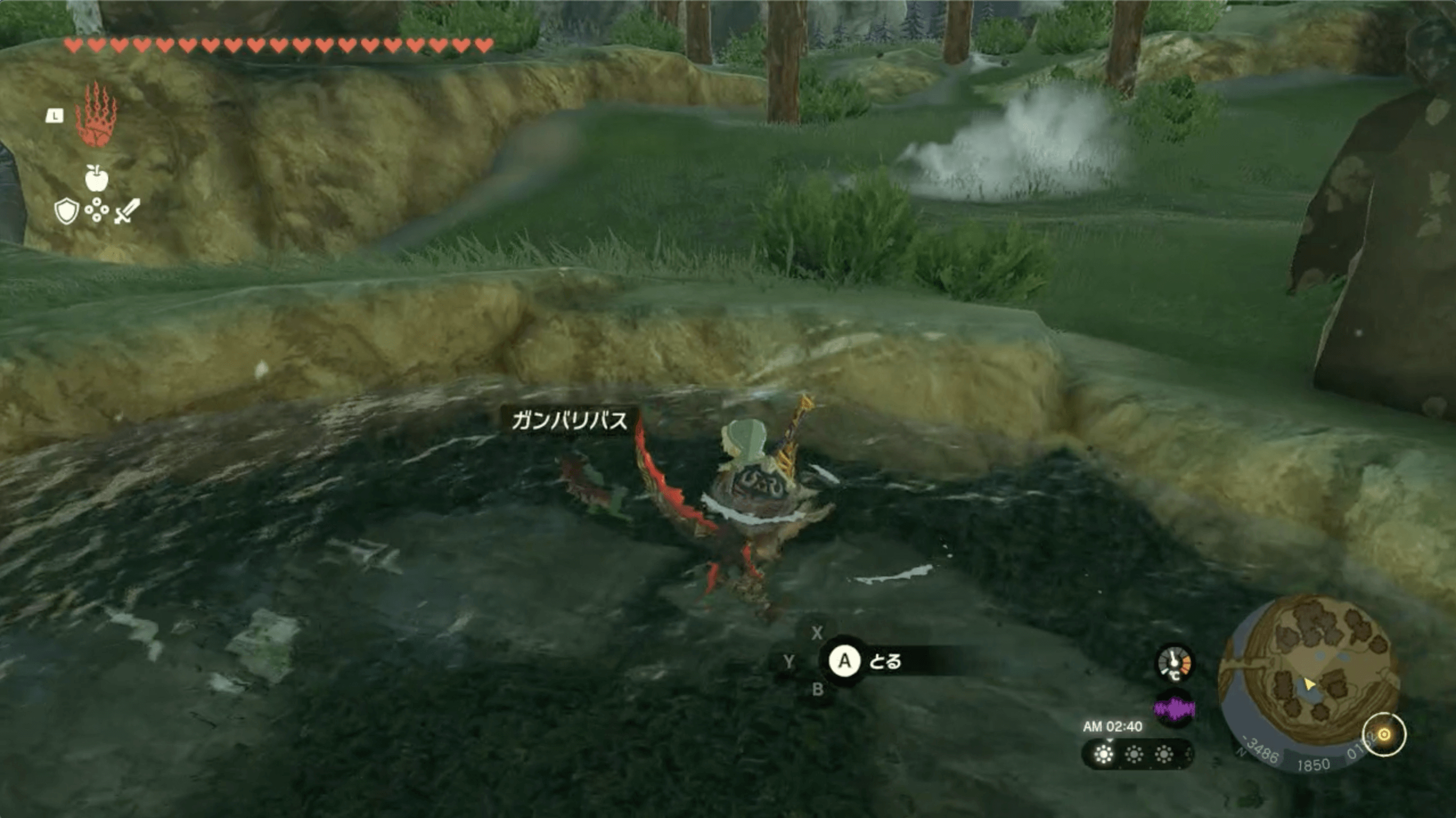 ゲンコに話しかけてミニチャレンジを受注したら、リトの村の東にある橋を渡った先のガンバリマスがいる池に向かおう。ガンバリマスは、追いかければ簡単に捕まえられるため、壁際に追い詰めると良い。