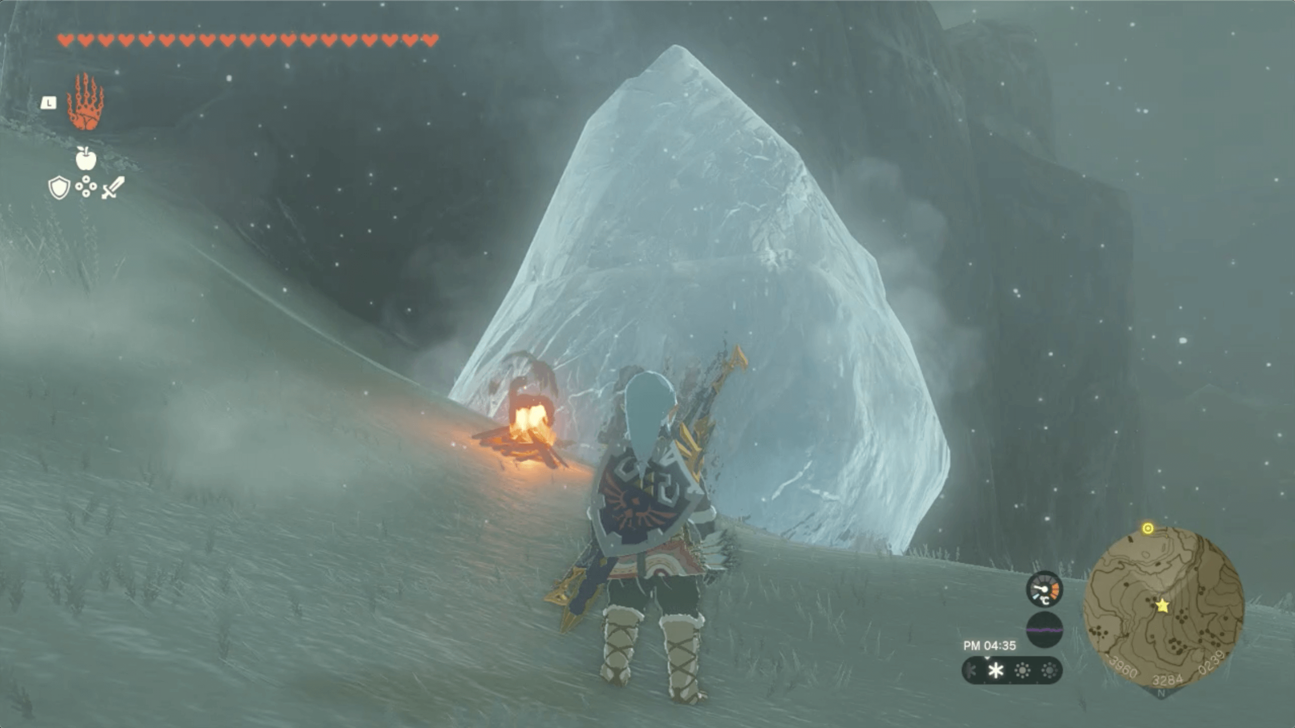 3つの秘湯の中心地に着いたら、焚き火を起こして巨大な氷を溶かそう。なお、巨大な氷はすべて溶かす必要はなく、洞窟との間にすき間ができれば問題ない。