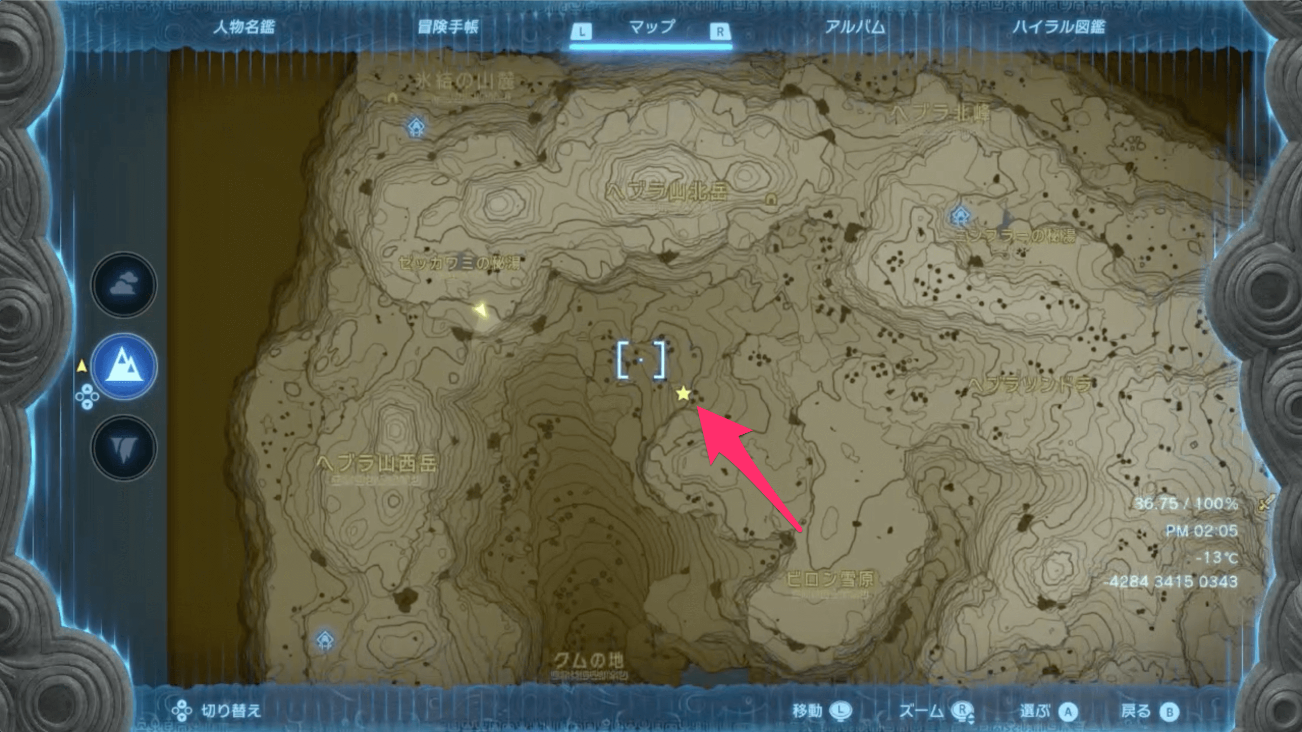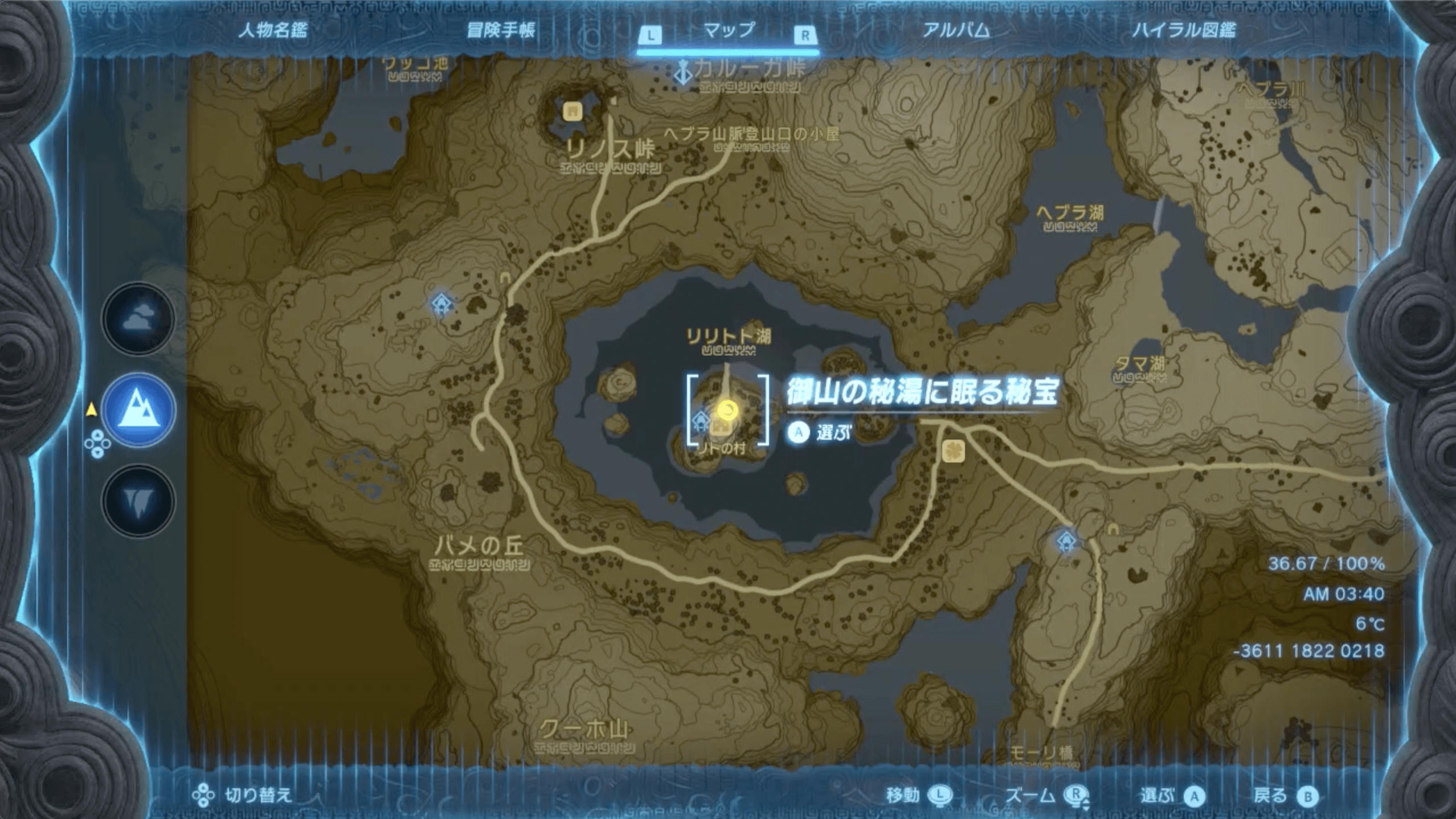 「リトの村」にいる「チューリ」に話しかけてチャレンジを始めたら、ヘブラ地方にある3つの秘湯の中心に向かおう。なお、中心地へは、カルーガ峠鳥望台から西ヘブラ空諸島を経由すればたどり着ける。