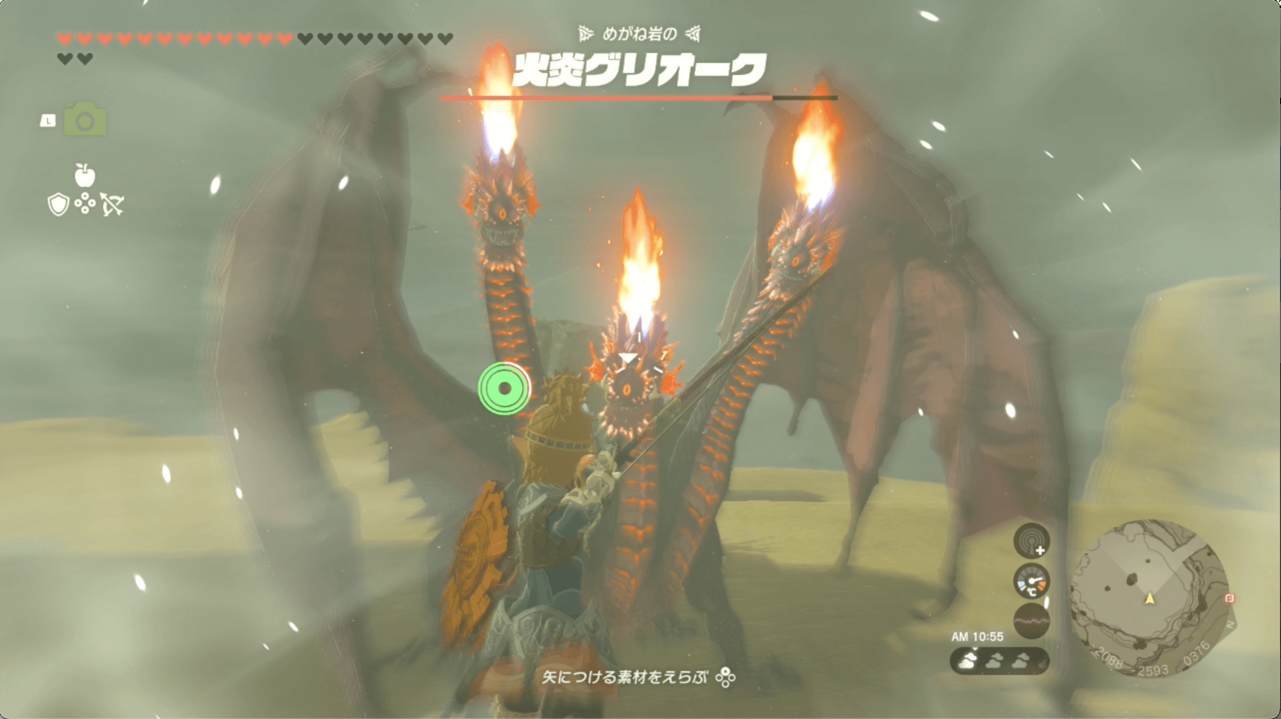 火炎グリオークは、3つの首を全て倒すと地面にダウンする。自力で首を狙うのは難しいので、矢にキースの目玉をつけて追尾させよう。また、目玉はアイスキースやエレキースなどほかの種類のものでも問題ない。