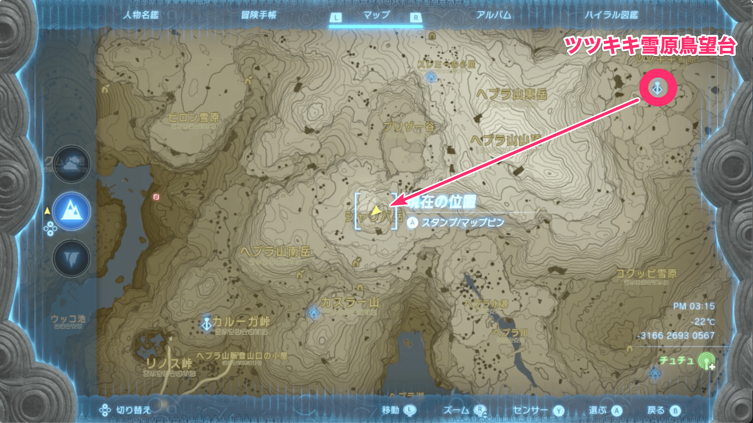 「雪原の馬宿を彩る絵」で必要なウツシエは、シャリバ岳の頂上から撮れる。シャリバ岳はツツキキ雪原鳥望台から南西へ飛ぶと辿り着けるので、あらかじめ鳥望台を解放しておこう。